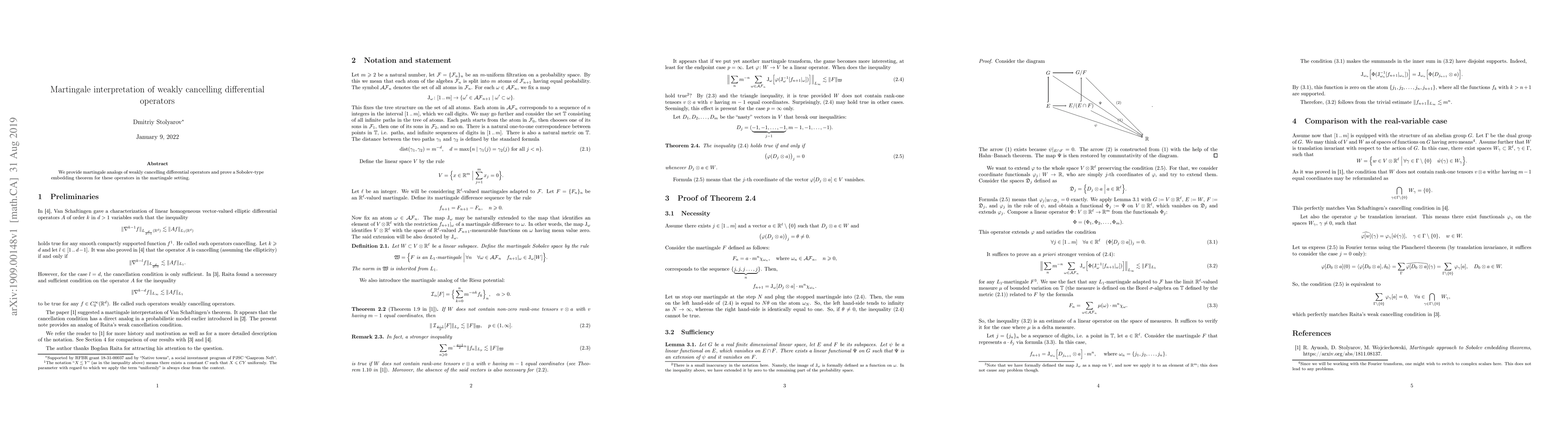 We provide martingale analogs of weakly cancelling differential operators and prove a Sobolev-type embedding theorem for these operators in the martingale setting.