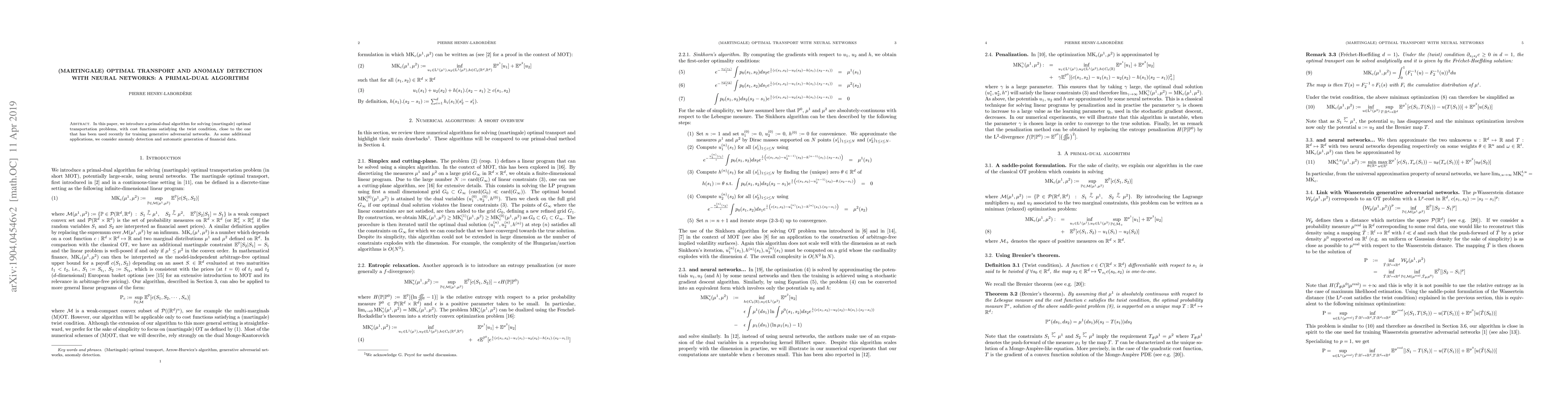 A new algorithm is introduced for solving optimal transportation problems using neural networks, with applications in anomaly detection and generating financial data.