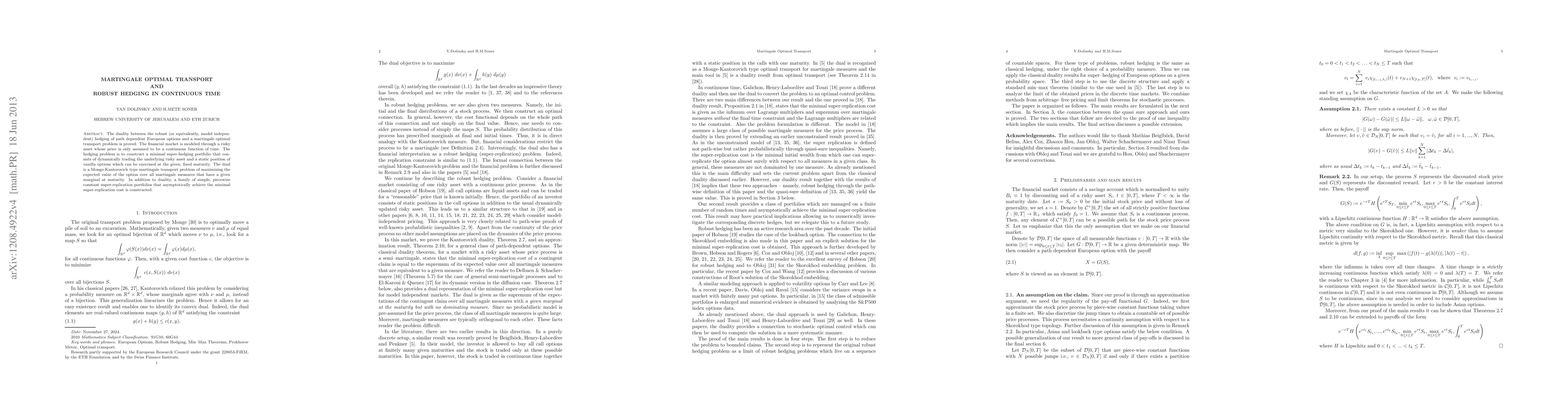 This paper establishes the duality between robust hedging of path-dependent European options and a martingale optimal transport problem, showing that the optimal hedging strategy corresponds to maximizing the expected value of the option under martingale measures. It also provides simple portfolios that asymptotically achieve the minimal super-replication cost.