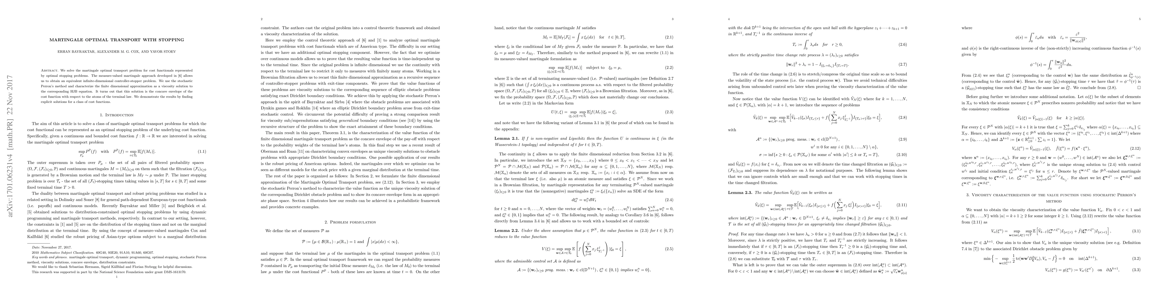 This paper solves the martingale optimal transport problem through optimal stopping, utilizing a measure-valued martingale approach. The solution is characterized as the concave envelope of the cost function, and explicit solutions are derived for specific cost functions.