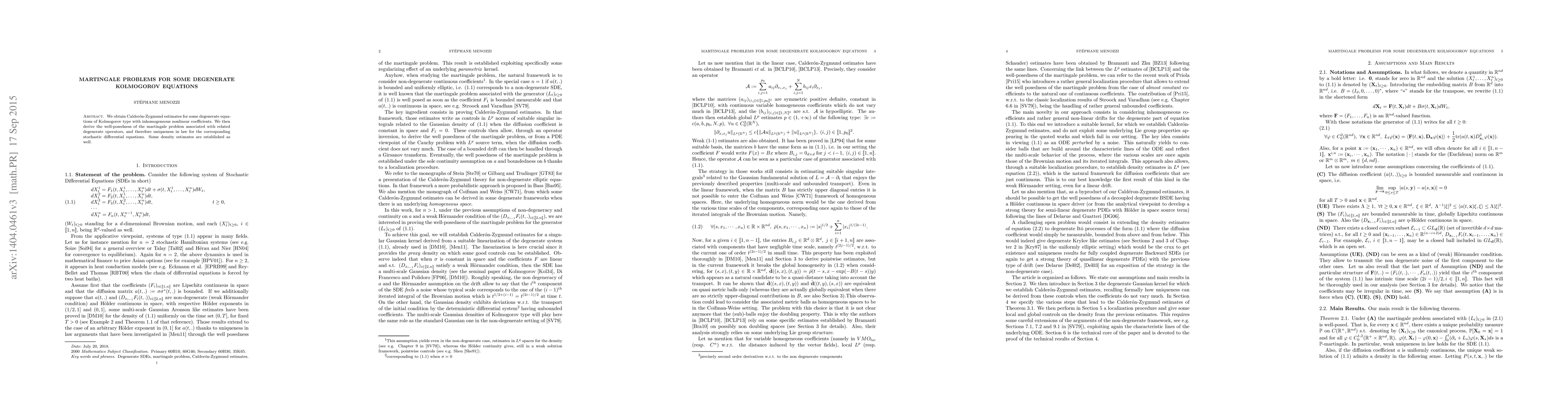 We obtain Calder{\'o}n-Zygmund estimates for some degenerate equations of Kolmogorov type with inhomogeneous coefficients. We then derive the well-posedness of the martingale problem associated to related degenerate operators, and therefore uniqueness in law for the corresponding stochastic differential equations. Some density estimates are established as well.