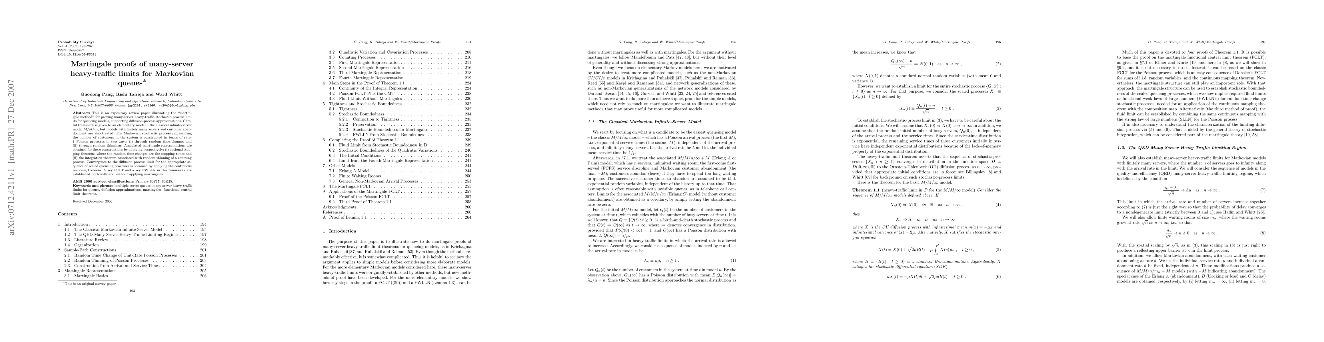 This paper reviews the martingale method for proving many-server heavy-traffic limits in Markovian queueing models, focusing on diffusion-process approximations. It constructs the Markovian stochastic process using rate-1 Poisson processes and establishes convergence to the diffusion limit via martingale representations and the continuous mapping theorem.