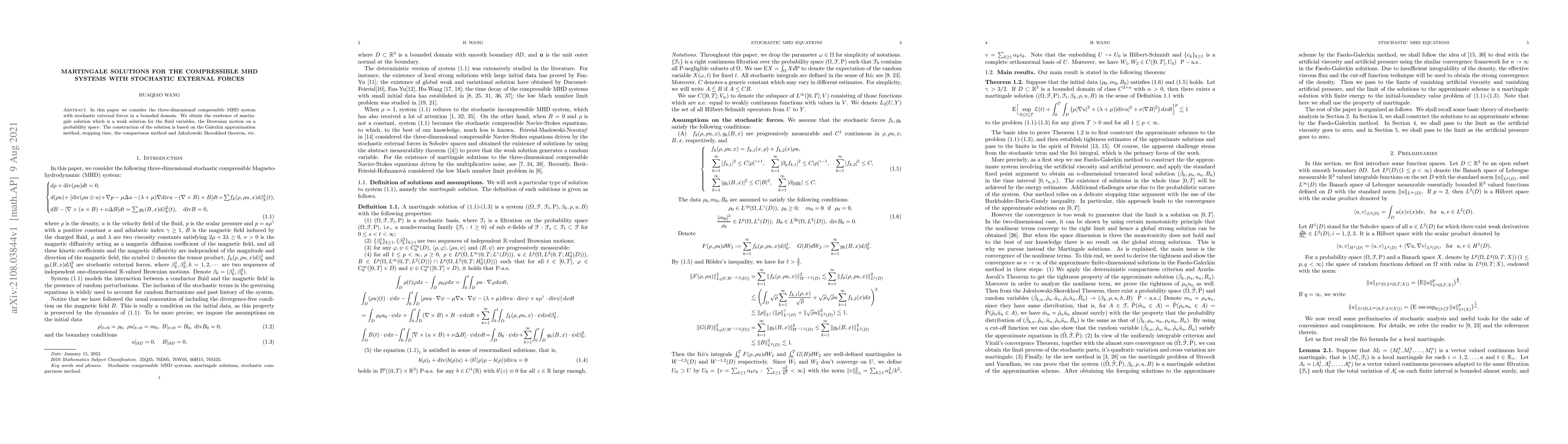 In this paper we consider the three-dimensional compressible MHD system with stochastic external forces in a bounded domain. We obtain the existence of martingale solution which is a weak solution for the fluid variables, the Brownian motion on a probability space. The construction of the solution is based on the Galerkin approximation method, stopping time, the compactness method and Jakubowski Skorokhod theorem, etc.