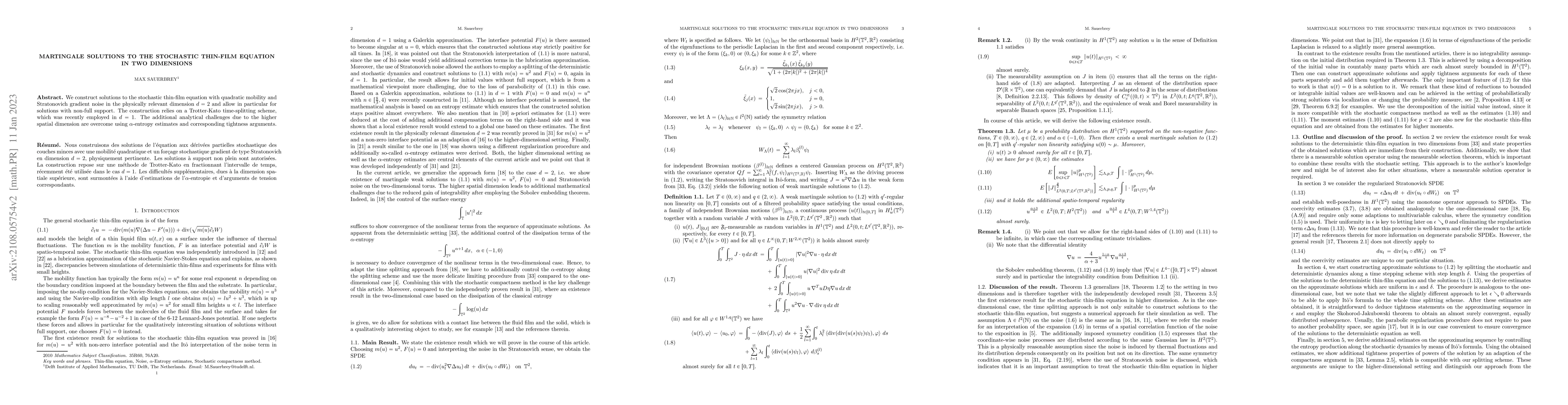 This paper constructs martingale solutions to the stochastic thin-film equation in two dimensions with quadratic mobility and Stratonovich noise, employing a Trotter-Kato time-splitting scheme. Analytical challenges in higher dimensions are addressed using $\alpha$-entropy estimates and tightness arguments.