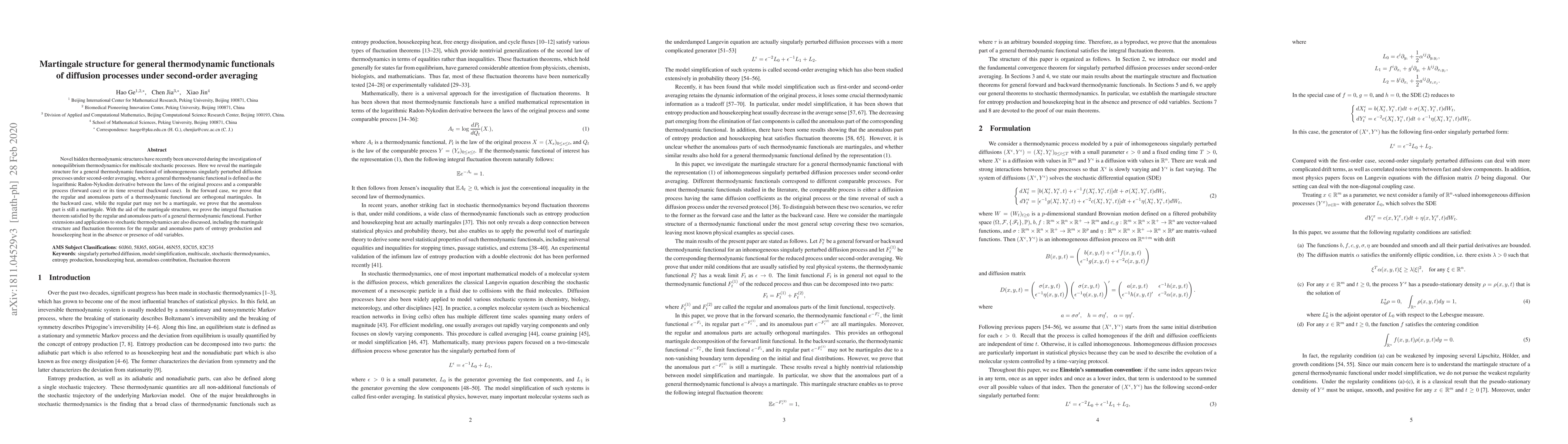 This paper explores the martingale structure of general thermodynamic functionals for inhomogeneous diffusion processes under second-order averaging. It reveals that the regular and anomalous parts of these functionals exhibit orthogonal martingale properties, leading to integral fluctuation theorems for both parts, with implications for stochastic thermodynamics.