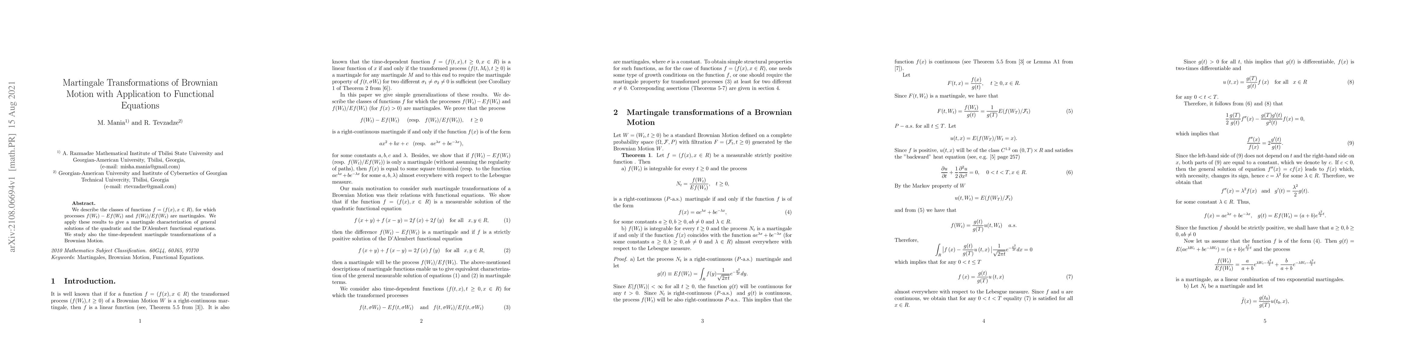 We describe the classes of functions $f=(f(x), x\in R)$, for which processes $f(W_t)-Ef(W_t)$ and $f(W_t)/Ef(W_t)$ are martingales. We apply these results to give a martingale characterization of general solutions of the quadratic and the D'Alembert functional equations. We study also the time-dependent martingale transformations of a Brownian Motion.