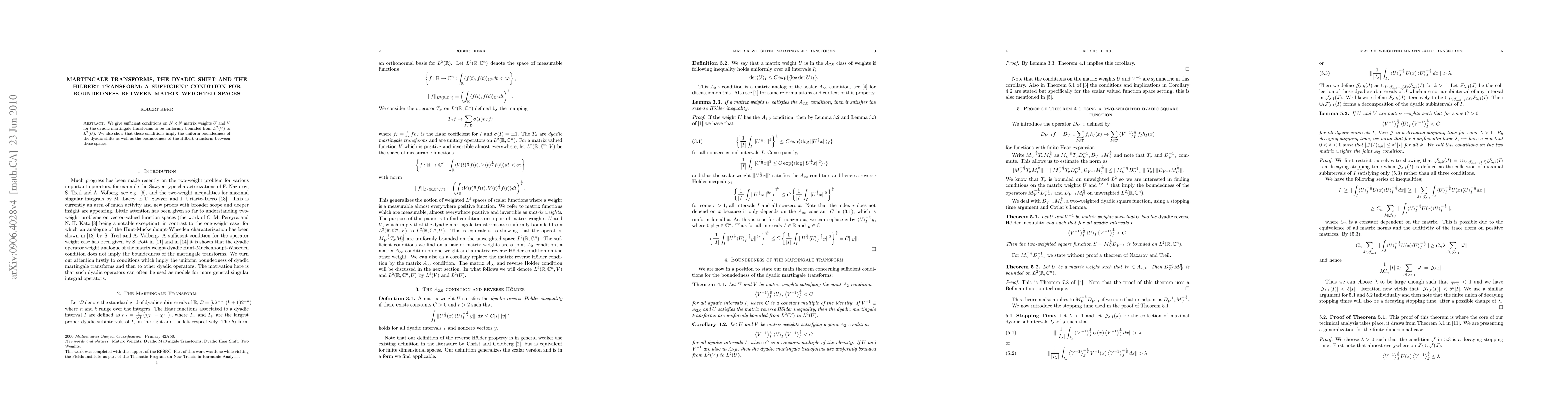 This paper establishes sufficient conditions on matrix weights for martingale transforms to be uniformly bounded from $L^2(V)$ to $L^2(U)$, and demonstrates that these conditions also ensure the boundedness of dyadic shifts and the Hilbert transform between these matrix weighted spaces.