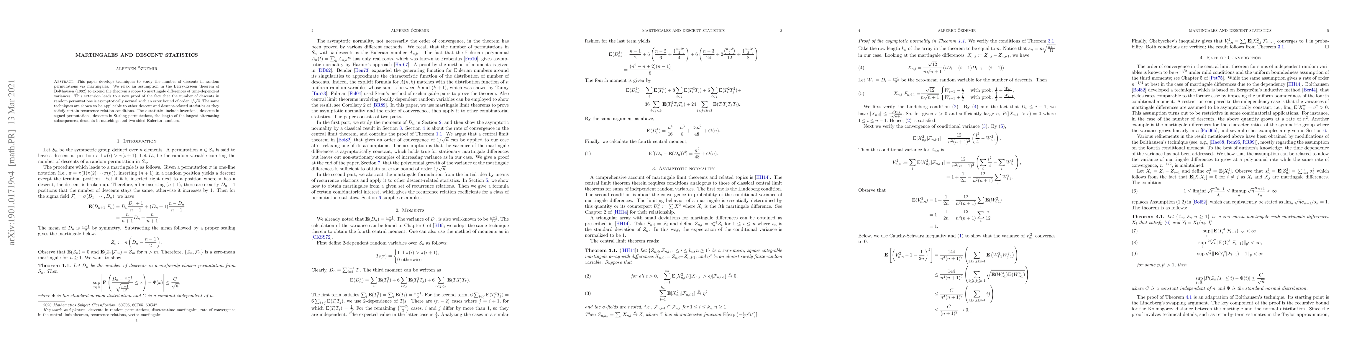 The paper develops techniques to study descent statistics in random permutations using martingales, extending the Berry-Esseen theorem to martingale differences with time-dependent variances.