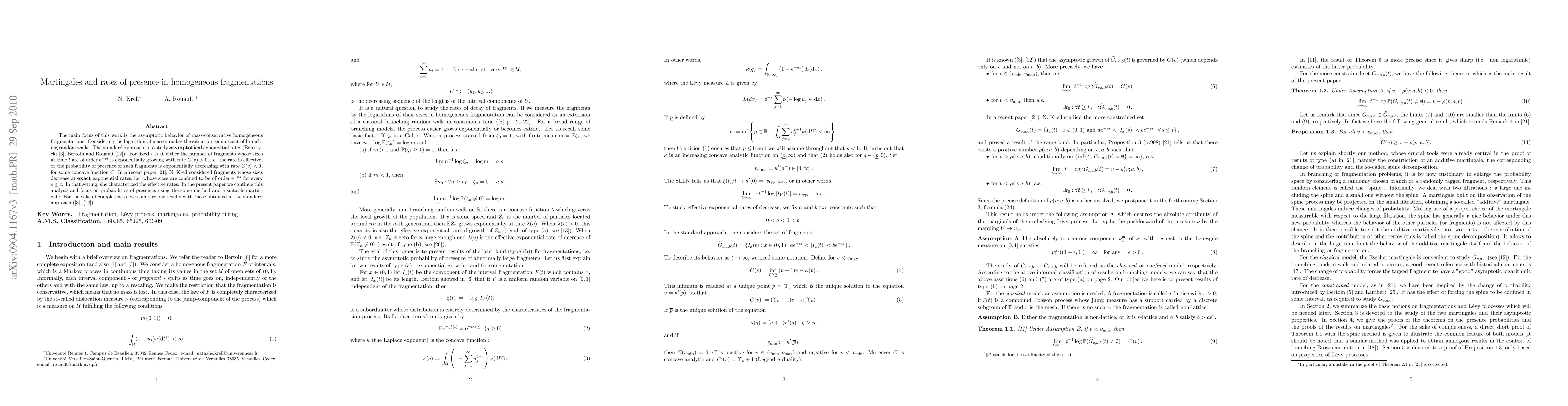 This paper investigates the asymptotic behavior of mass-conservative homogeneous fragmentations, focusing on the exponential rates of presence of fragments of specific sizes. It employs the spine method and martingales to analyze the probabilities of fragments whose sizes decrease at exact exponential rates.