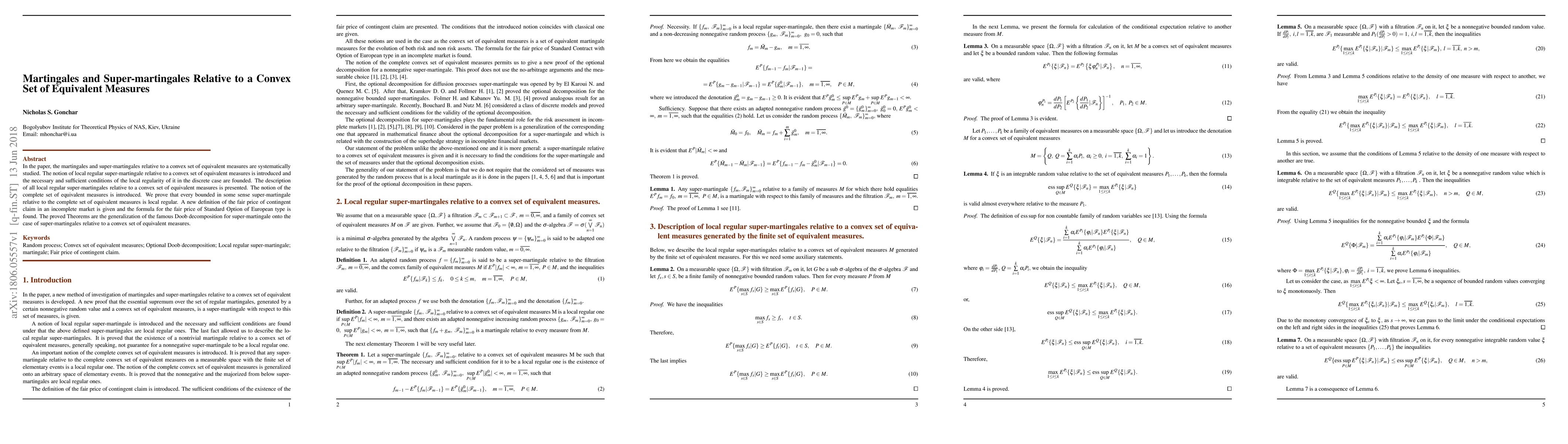 In the paper, the martingales and super-martingales relative to a convex set of equivalent measures are systematically studied. The notion of local regular super-martingale relative to a convex set of equivalent measures is introduced and the necessary and sufficient conditions of the local regularity of it in the discrete case are founded. The description of all local regular super-martingales relative to a convex set of equivalent measures is presented. The notion of the complete set of equivalent measures is introduced. We prove that every bounded in some sense super-martingale relative to the complete set of equivalent measures is local regular. A new definition of the fair price of contingent claim in an incomplete market is given and the formula for the fair price of Standard Option of European type is found. The proved Theorems are the generalization of the famous Doob decomposition for super-martingale onto the case of super-martingales relative to a convex set of equivalent measures.