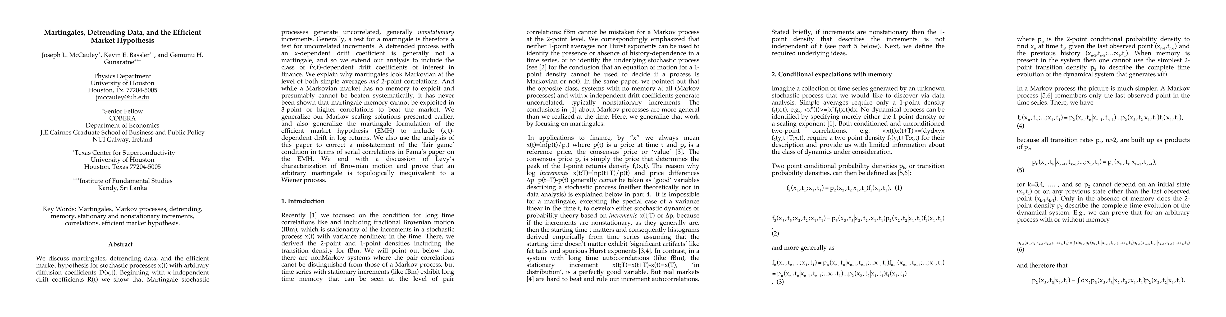 We discuss martingales, detrending data, and the efficient market hypothesis for stochastic processes x(t) with arbitrary diffusion coefficients D(x,t). Beginning with x-independent drift coefficients R(t) we show that Martingale stochastic processes generate uncorrelated, generally nonstationary increments. Generally, a test for a martingale is therefore a test for uncorrelated increments. A detrended process with an x- dependent drift coefficient is generally not a martingale, and so we extend our analysis to include the class of (x,t)-dependent drift coefficients of interest in finance. We explain why martingales look Markovian at the level of both simple averages and 2-point correlations. And while a Markovian market has no memory to exploit and presumably cannot be beaten systematically, it has never been shown that martingale memory cannot be exploited in 3-point or higher correlations to beat the market. We generalize our Markov scaling solutions presented earlier, and also generalize the martingale formulation of the efficient market hypothesis (EMH) to include (x,t)-dependent drift in log returns. We also use the analysis of this paper to correct a misstatement of the fair game condition in terms of serial correlations in Fama's paper on the EMH.