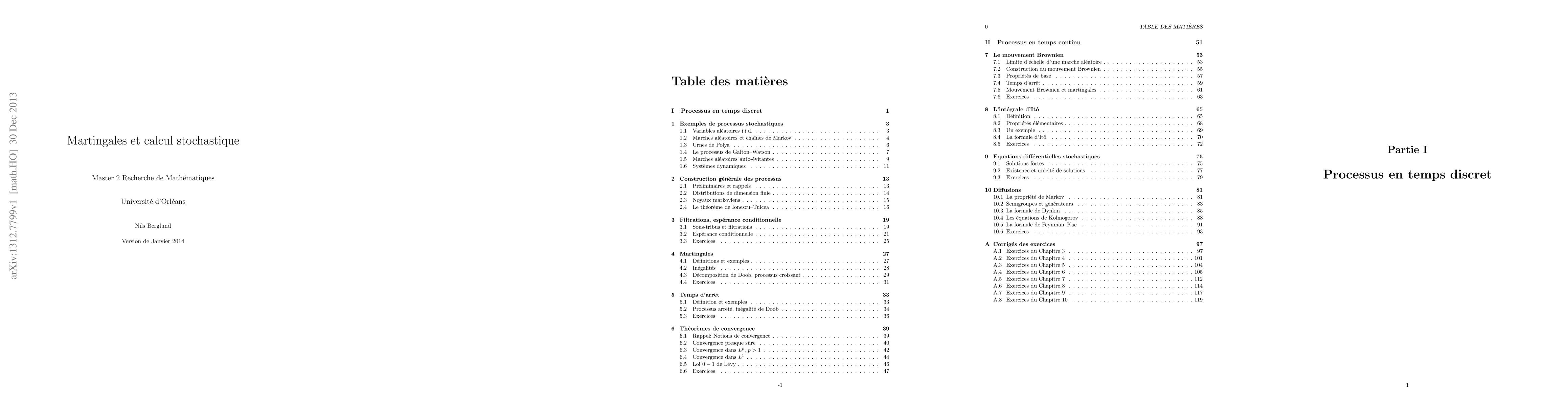 Summary: These lecture notes cover advanced topics in martingales and stochastic calculus, including discrete-time martingales, stopping times, convergence theorems, and stochastic processes like Brownian motion, Itô integrals, and stochastic differential equations. Exercises are provided with corrections for deeper understanding.