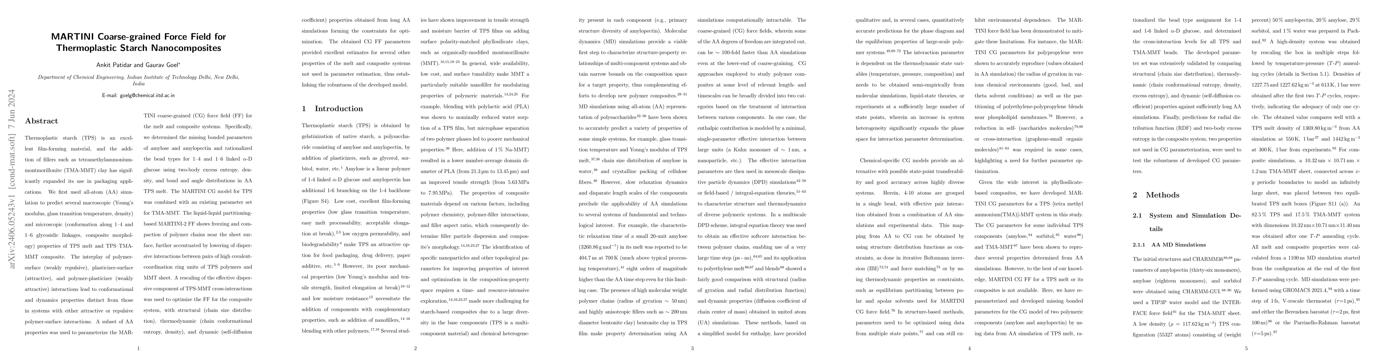 This paper develops a MARTINI coarse-grained force field for thermoplastic starch (TPS) nanocomposites incorporating tetramethylammonium-montmorillonite (TMA-MMT) clay. The study first employs all-atom simulations to predict properties of TPS and TPS-TMA-MMT composites, then uses these to parameterize the MARTINI force field, achieving robust predictions for various properties of both the TPS melt and composite systems.