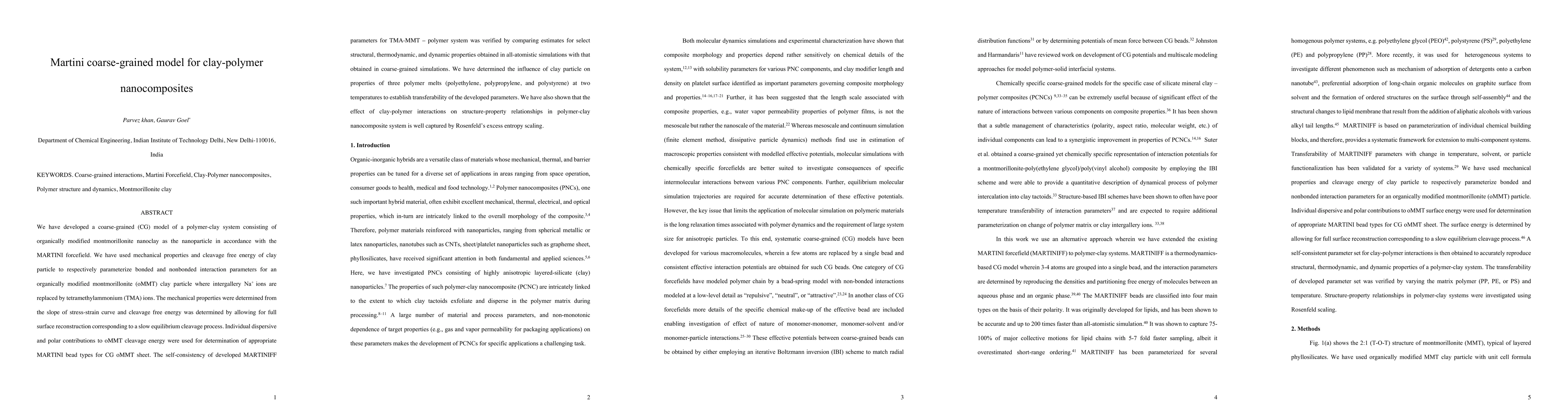 This research develops a coarse-grained (CG) MARTINI model for polymer-clay nanocomposites, using mechanical properties and cleavage free energy to parameterize interactions. The developed parameters are validated against all-atomistic simulations, and their transferability across different polymer melts and temperatures is demonstrated.