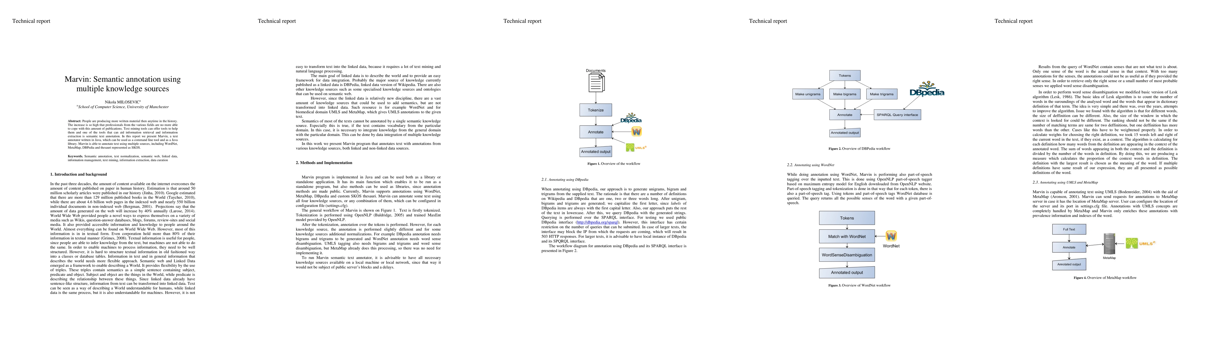 The paper introduces Marvin, a Java-based text annotator that utilizes multiple knowledge sources like WordNet, MetaMap, DBPedia, and SKOS thesauri to aid in semantic text annotation, addressing the challenge of managing the surge in written material across various fields.