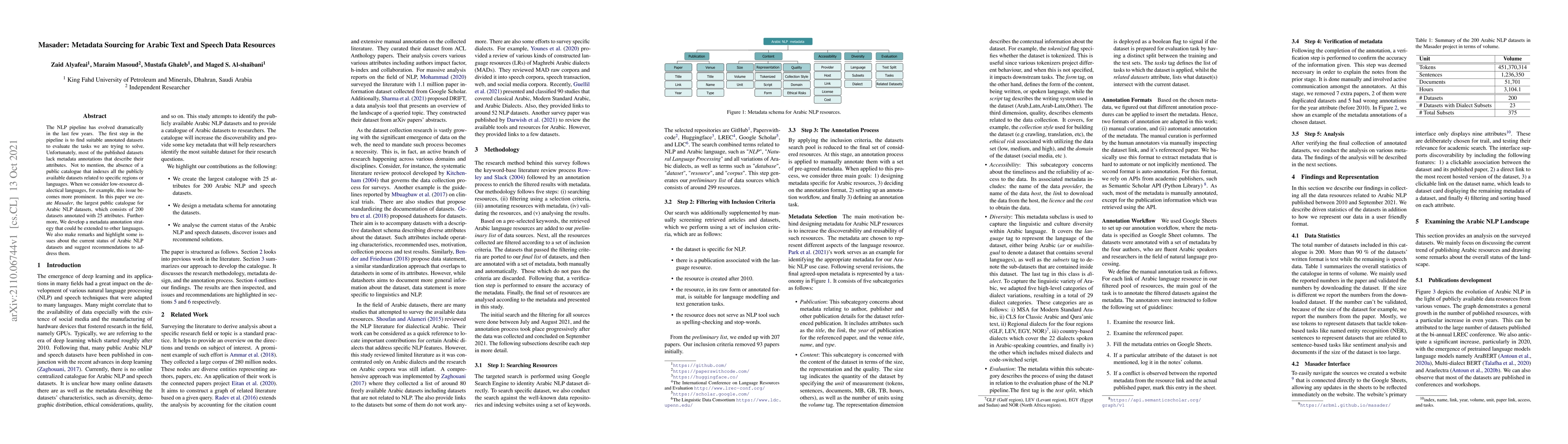 The NLP pipeline has evolved dramatically in the last few years. The first step in the pipeline is to find suitable annotated datasets to evaluate the tasks we are trying to solve. Unfortunately, most of the published datasets lack metadata annotations that describe their attributes. Not to mention, the absence of a public catalogue that indexes all the publicly available datasets related to specific regions or languages. When we consider low-resource dialectical languages, for example, this issue becomes more prominent. In this paper we create \textit{Masader}, the largest public catalogue for Arabic NLP datasets, which consists of 200 datasets annotated with 25 attributes. Furthermore, We develop a metadata annotation strategy that could be extended to other languages. We also make remarks and highlight some issues about the current status of Arabic NLP datasets and suggest recommendations to address them.