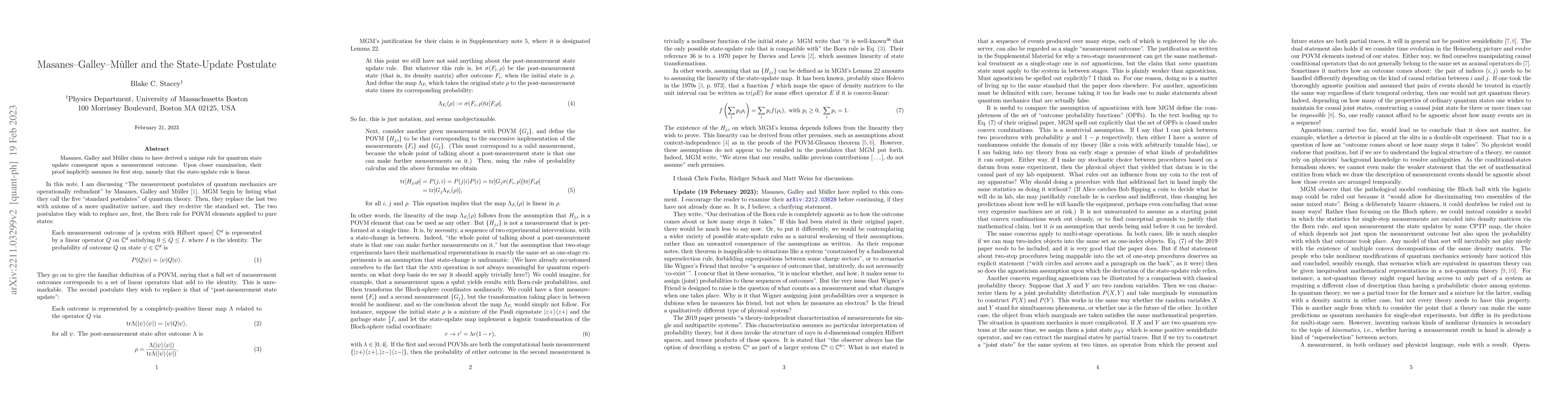 Summary: Masanes, Galley, and Müller propose a unique quantum state update rule following measurement outcomes, but their proof is found to implicitly assume the linearity of the state-update rule, which undermines the novelty of their derivation.