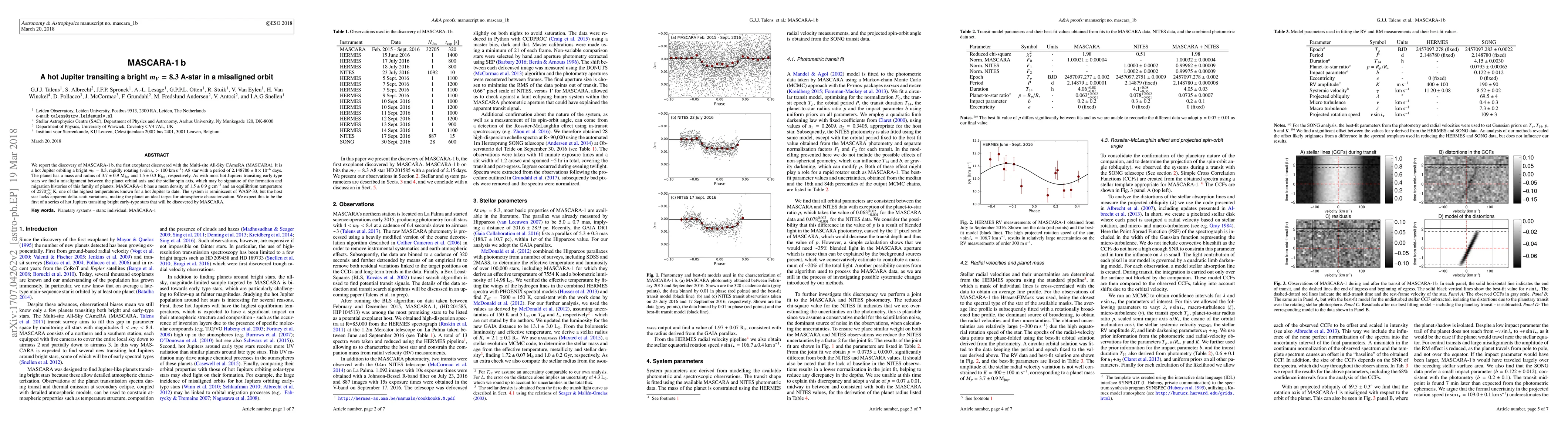 MASCARA-1 b is a hot Jupiter discovered by the MASCARA project, orbiting a bright A-type star with a misaligned orbit. It has a high equilibrium temperature and is a promising candidate for atmospheric studies.