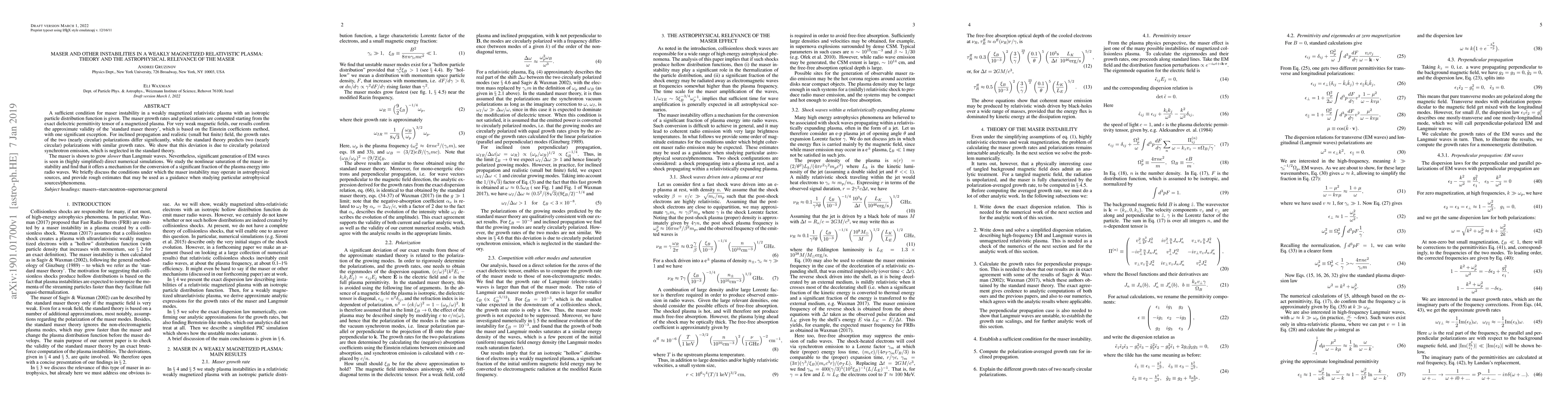 This paper develops a theoretical framework for maser instability in weakly magnetized relativistic plasmas, showing significant deviations from standard maser theory due to synchrotron emission. It also explores the potential astrophysical relevance of maser instabilities in converting plasma energy into radio waves.
