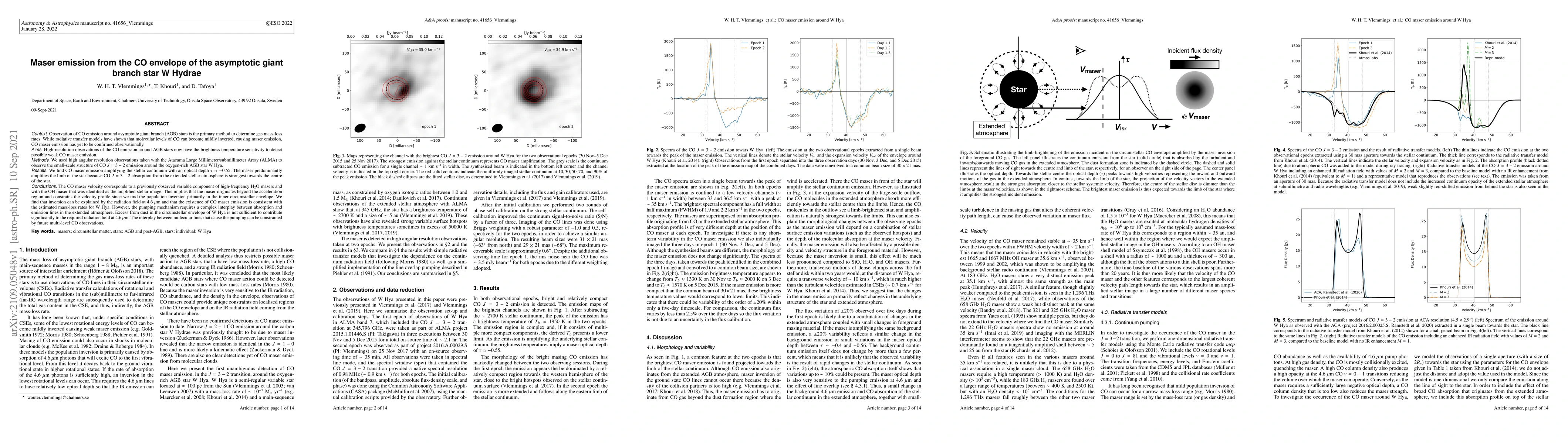 This study confirms the first observational detection of CO maser emission around the asymptotic giant branch star W Hydrae using ALMA observations. The maser amplifies the stellar continuum and is primarily found in the inner circumstellar envelope, suggesting a complex interplay between absorption and emission lines in the extended atmosphere for its pumping mechanism.