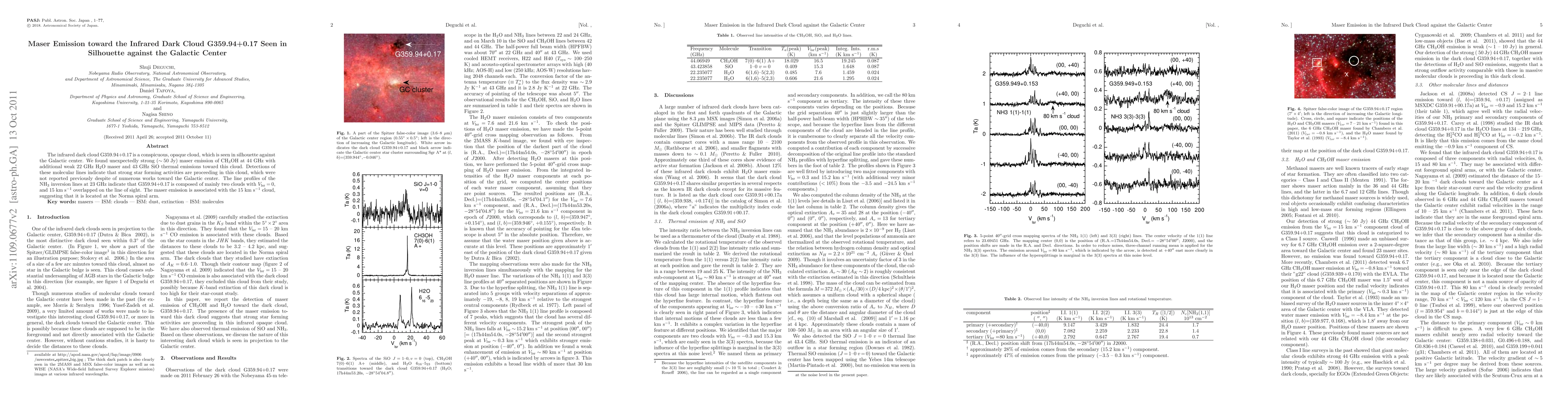 The infrared dark cloud G359.94+0.17 is a conspicuous, opaque cloud, which is seen in silhouette against the Galactic center. We found unexpectedly strong (~50 Jy) maser emission of CH3OH at 44 GHz with additional weak 22 GHz H2O maser and 43 GHz SiO thermal emissions toward this cloud. Detections of these molecular lines indicate that strong star forming activities are proceeding in this cloud, which were not reported previously despite of numerous works toward the Galactic center. The line profiles of the NH3 inversion lines at 23 GHz indicate that G359.94+0.17 is composed of mainly two clouds with V(lsr)= 0, and 15 km/s overlapped on the line of sight. The maser emission is associated with the 15 km/s cloud, suggesting that it is located at the Norma spiral arm.