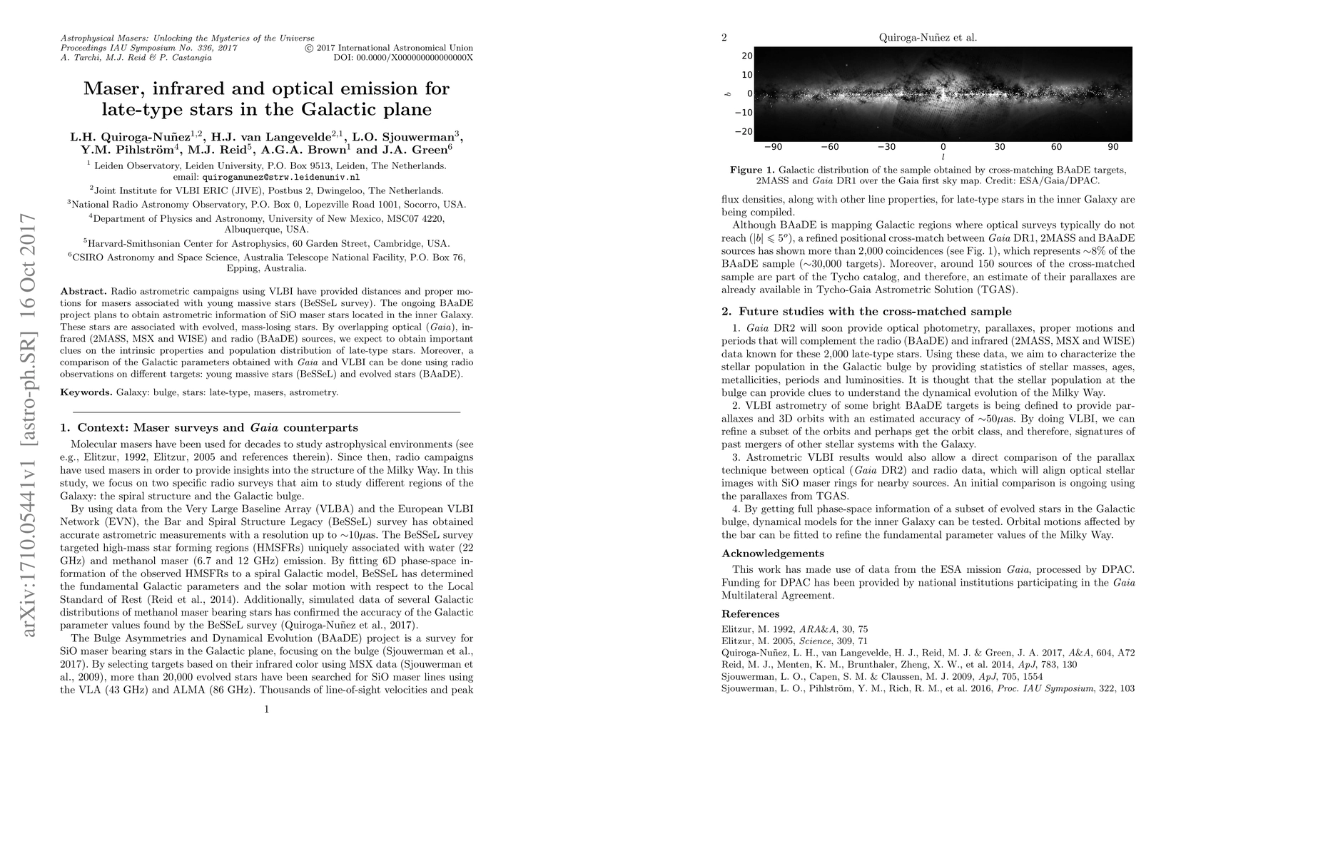 Radio astrometric campaigns using VLBI have provided distances and proper motions for masers associated with young massive stars (BeSSeL survey). The ongoing BAaDE project plans to obtain astrometric information of SiO maser stars located in the inner Galaxy. These stars are associated with evolved, mass-losing stars. By overlapping optical (Gaia), infrared (2MASS, MSX and WISE) and radio (BAaDE) sources, we expect to obtain important clues on the intrinsic properties and population distribution of late-type stars. Moreover, a comparison of the Galactic parameters obtained with Gaia and VLBI can be done using radio observations on different targets: young massive stars (BeSSeL) and evolved stars (BAaDE).