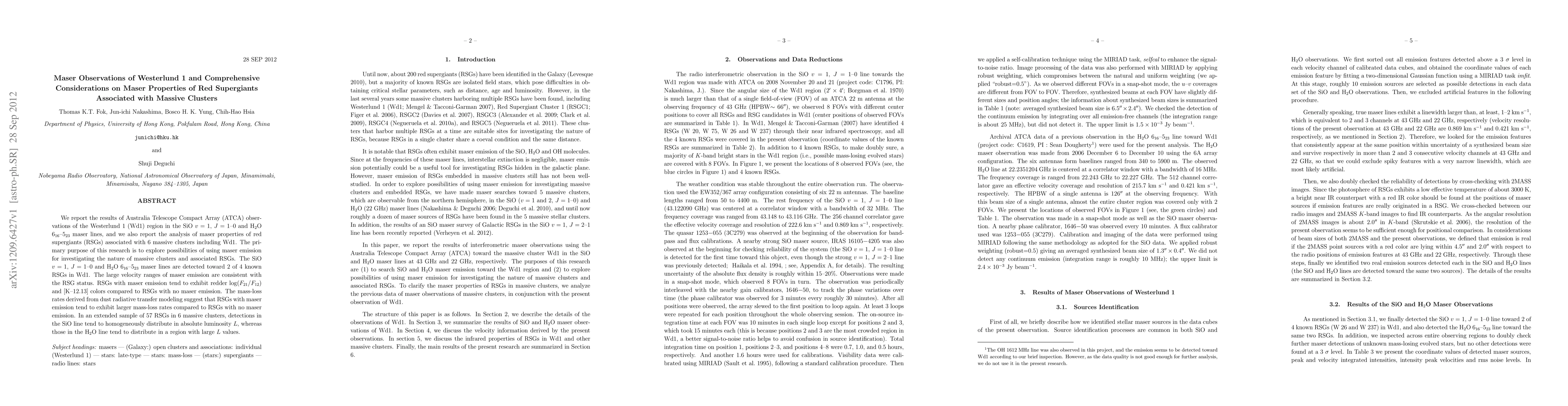 This paper reports SiO and H2O maser observations of Westerlund 1 and other massive clusters, revealing that red supergiants (RSGs) with maser emission exhibit larger mass-loss rates and redder colors compared to those without. The study suggests maser emissions can provide insights into the nature of RSGs and their associated massive clusters.