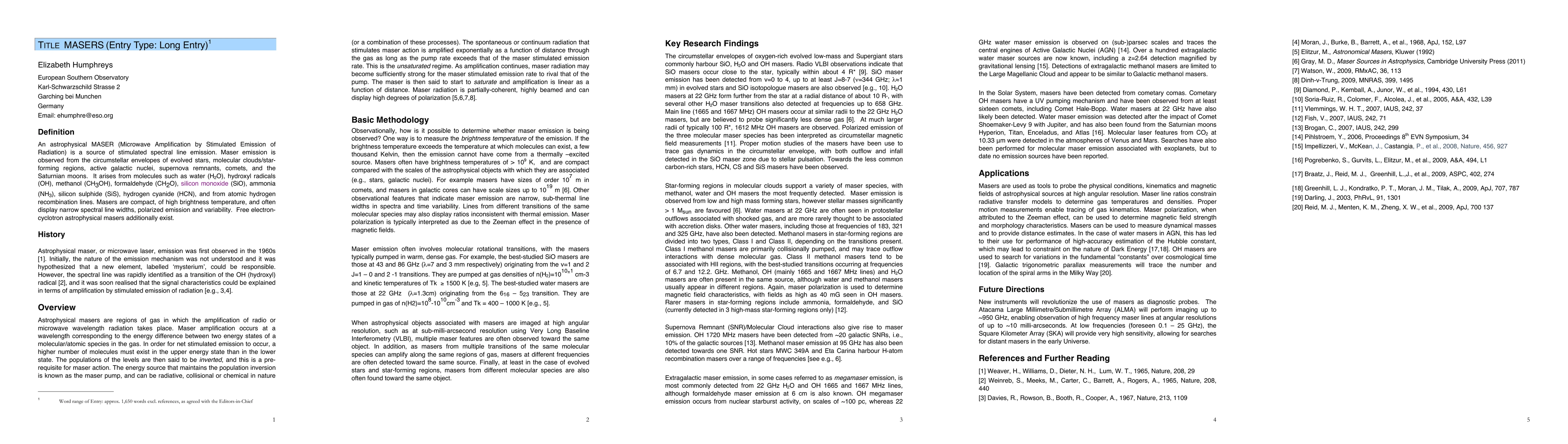 An astrophysical MASER (Microwave Amplification by Stimulated Emission of Radiation) is a source of stimulated spectral line emission. Maser emission is observed from the circumstellar envelopes of evolved stars, molecular clouds/star-forming regions, active galactic nuclei, supernova remnants, comets, and the Saturnian moons. It arises from molecules such as water (H2O), hydroxyl radicals (OH), methanol (CH3OH), formaldehyde (CH2O), silicon monoxide (SiO), ammonia (NH3), silicon sulphide (SiS), hydrogen cyanide (HCN), and from atomic hydrogen recombination lines. Masers are compact, of high brightness temperature, and often display narrow spectral line widths, polarized emission and variability. Free electron-cyclotron astrophysical masers additionally exist.