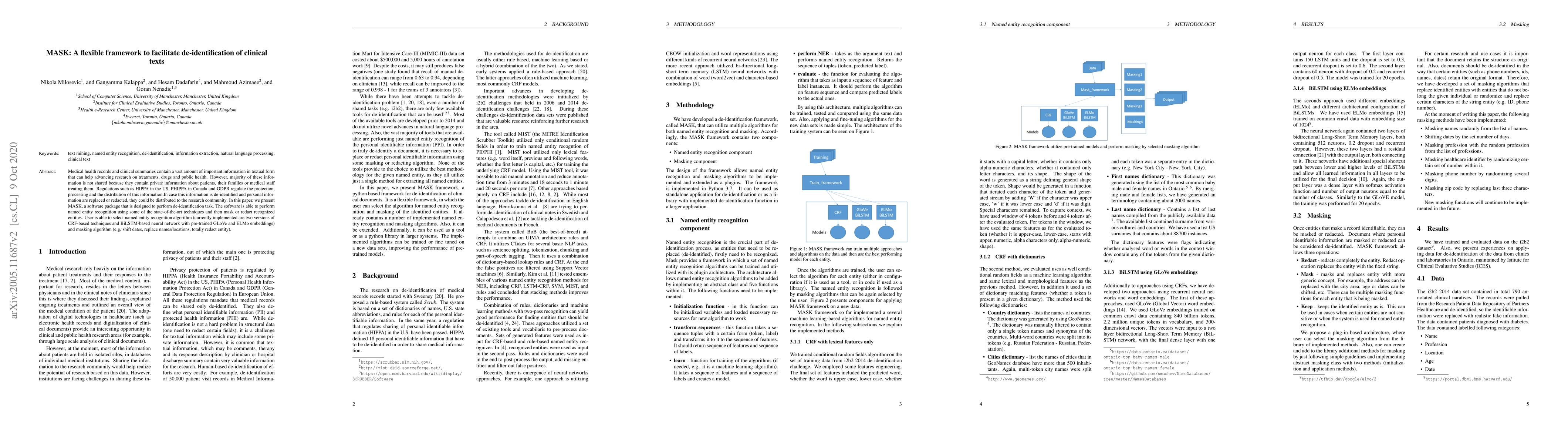 MASK is a software package that de-identifies clinical texts by recognizing named entities and masking them, allowing for the sharing of sensitive information in medical research. The tool enables researchers to select from various algorithms to perform entity recognition and masking.