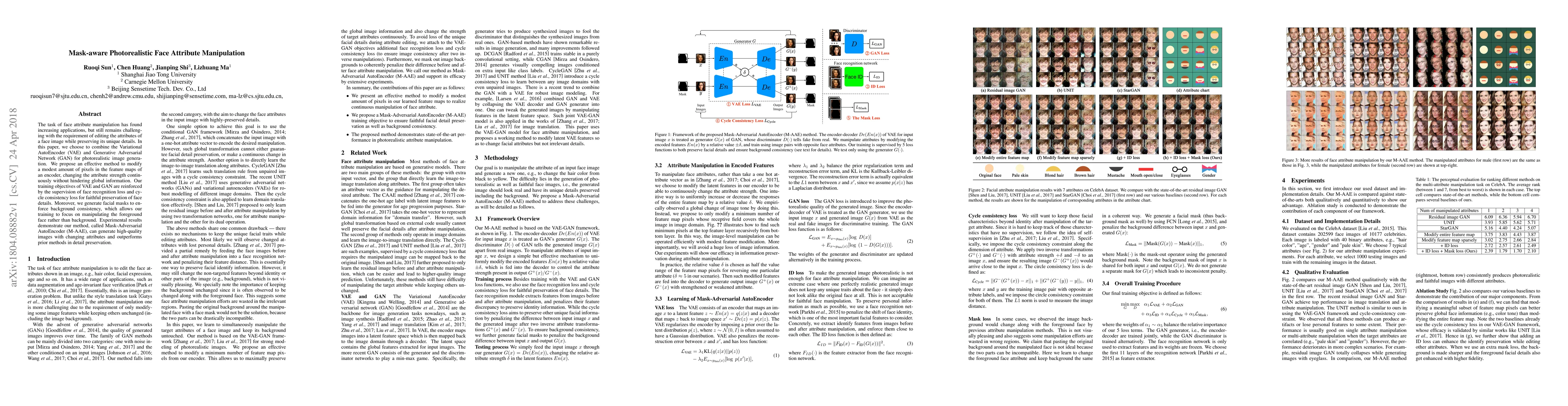This paper proposes a Mask-Adversarial AutoEncoder (M-AAE) combining VAE and GAN for photorealistic face attribute manipulation, focusing on preserving unique face details while modifying attributes. The method uses facial masks to ensure background consistency and outperforms prior methods in detail preservation.