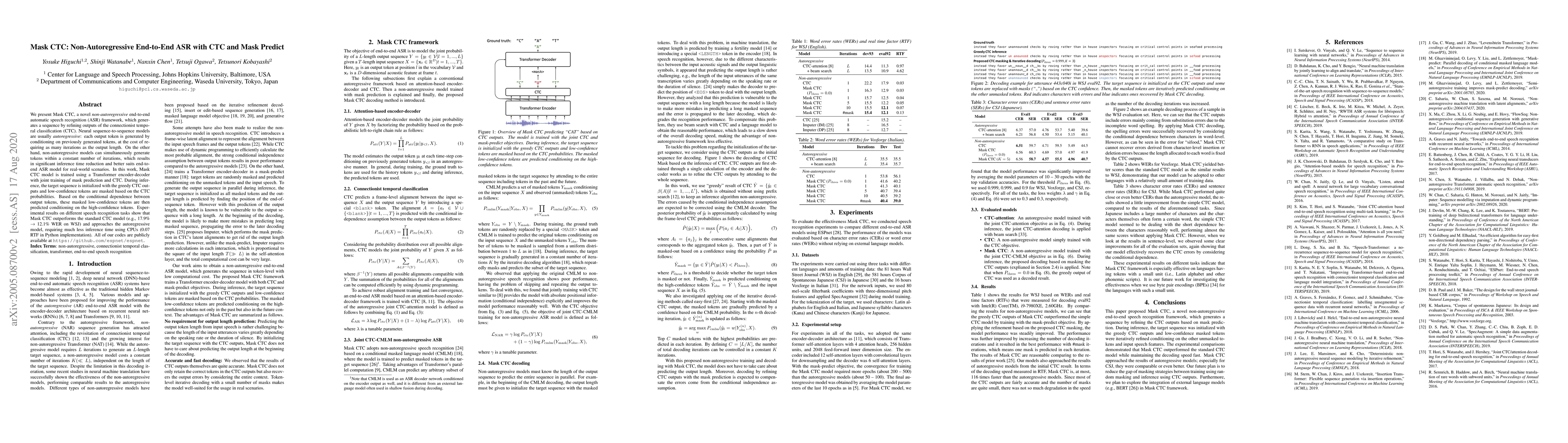 Mask CTC introduces a non-autoregressive end-to-end ASR framework that refines CTC outputs, significantly reducing inference time compared to autoregressive models, and achieving competitive word error rates on standard datasets.