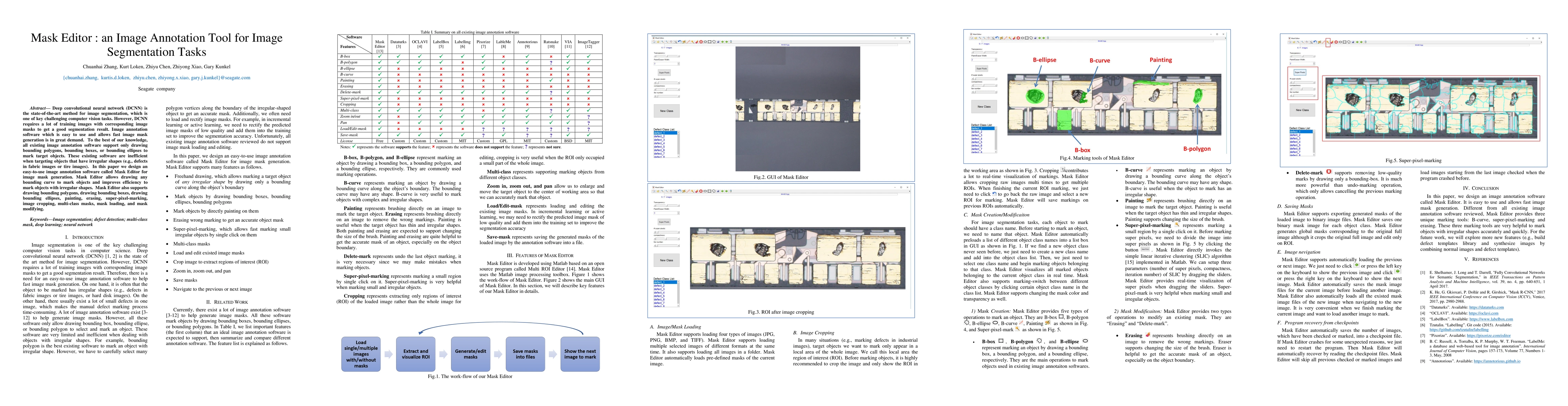 The Mask Editor is an innovative image annotation tool designed to facilitate the generation of image masks for deep convolutional neural networks in image segmentation tasks. It allows users to draw bounding curves for objects with irregular shapes, enhancing efficiency compared to existing tools that only support basic shapes.