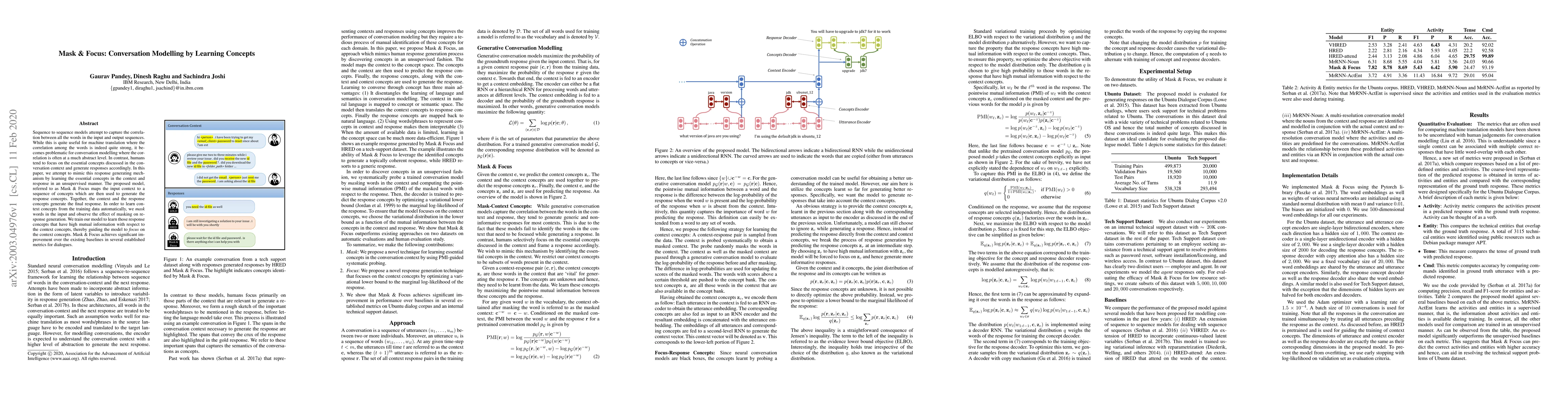 Sequence to sequence models attempt to capture the correlation between all the words in the input and output sequences. While this is quite useful for machine translation where the correlation among the words is indeed quite strong, it becomes problematic for conversation modelling where the correlation is often at a much abstract level. In contrast, humans tend to focus on the essential concepts discussed in the conversation context and generate responses accordingly. In this paper, we attempt to mimic this response generating mechanism by learning the essential concepts in the context and response in an unsupervised manner. The proposed model, referred to as Mask \& Focus maps the input context to a sequence of concepts which are then used to generate the response concepts. Together, the context and the response concepts generate the final response. In order to learn context concepts from the training data automatically, we \emph{mask} words in the input and observe the effect of masking on response generation. We train our model to learn those response concepts that have high mutual information with respect to the context concepts, thereby guiding the model to \emph{focus} on the context concepts. Mask \& Focus achieves significant improvement over the existing baselines in several established metrics for dialogues.