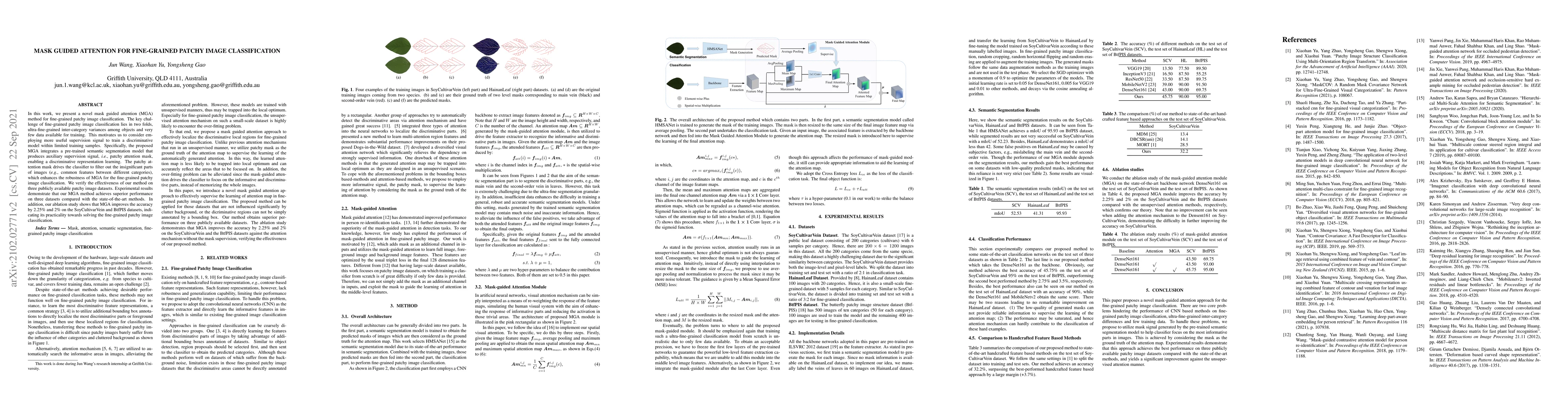 This paper introduces a mask guided attention (MGA) method for fine-grained patchy image classification, leveraging a pre-trained semantic segmentation model to generate a patchy attention mask that enhances discriminative representation learning. Experimental results show MGA outperforms state-of-the-art methods, achieving notable accuracy improvements on three datasets.