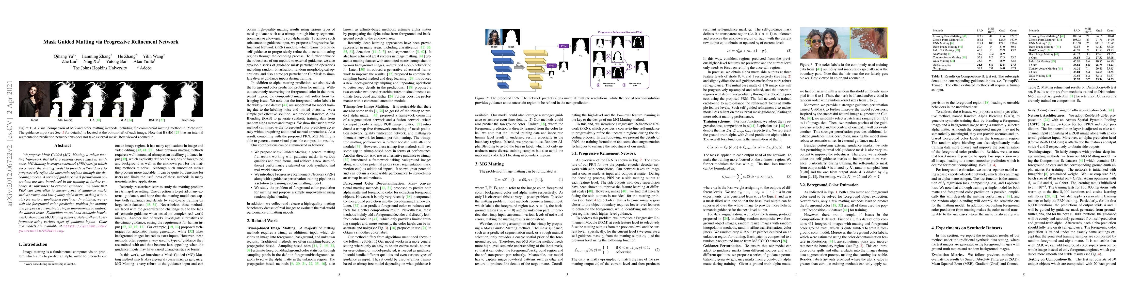 This paper proposes Mask Guided Matting (MG Matting), a robust matting framework that uses a Progressive Refinement Network (PRN) to refine uncertain regions progressively. The PRN design enhances the model's robustness through guidance mask perturbation during training, achieving state-of-the-art performance on various guidance inputs.
