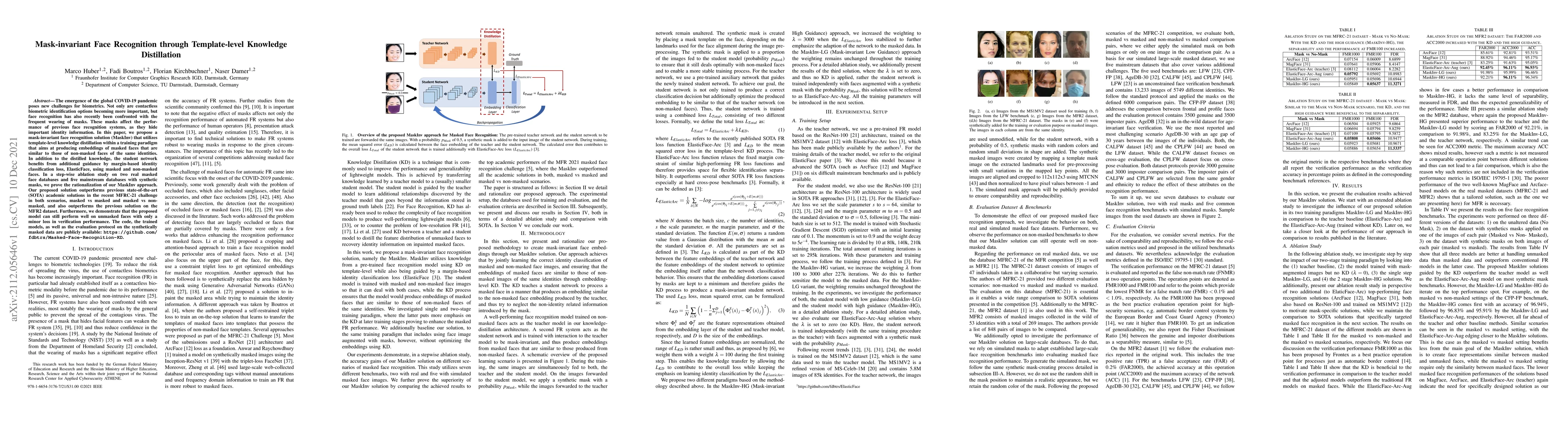 The emergence of the global COVID-19 pandemic poses new challenges for biometrics. Not only are contactless biometric identification options becoming more important, but face recognition has also recently been confronted with the frequent wearing of masks. These masks affect the performance of previous face recognition systems, as they hide important identity information. In this paper, we propose a mask-invariant face recognition solution (MaskInv) that utilizes template-level knowledge distillation within a training paradigm that aims at producing embeddings of masked faces that are similar to those of non-masked faces of the same identities. In addition to the distilled knowledge, the student network benefits from additional guidance by margin-based identity classification loss, ElasticFace, using masked and non-masked faces. In a step-wise ablation study on two real masked face databases and five mainstream databases with synthetic masks, we prove the rationalization of our MaskInv approach. Our proposed solution outperforms previous state-of-the-art (SOTA) academic solutions in the recent MFRC-21 challenge in both scenarios, masked vs masked and masked vs non-masked, and also outperforms the previous solution on the MFR2 dataset. Furthermore, we demonstrate that the proposed model can still perform well on unmasked faces with only a minor loss in verification performance. The code, the trained models, as well as the evaluation protocol on the synthetically masked data are publicly available: https://github.com/fdbtrs/Masked-Face-Recognition-KD.