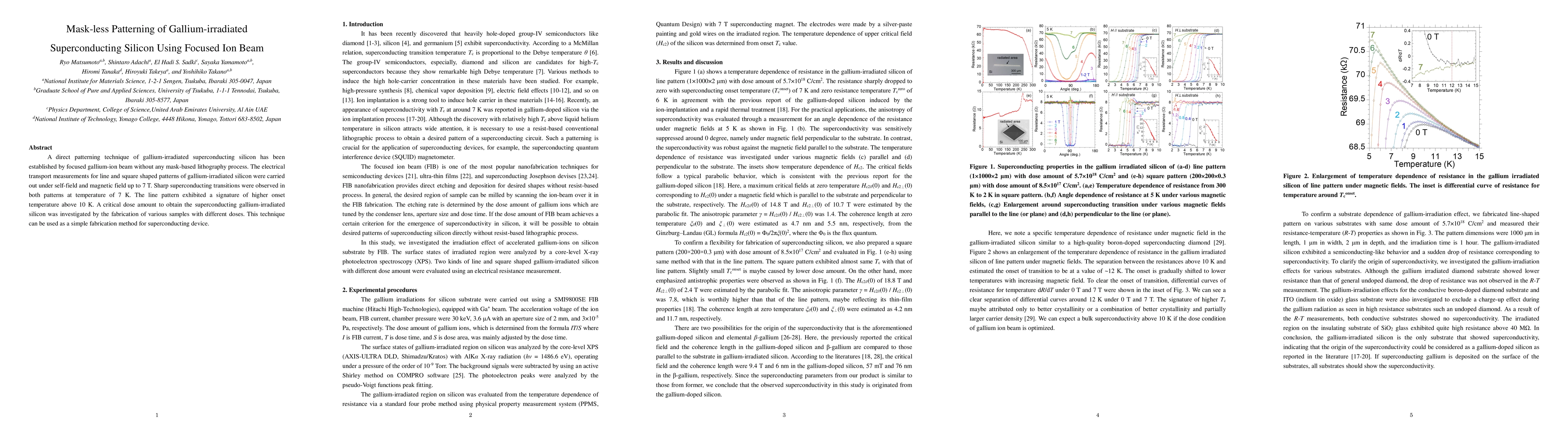 This paper establishes a mask-less patterning technique for gallium-irradiated superconducting silicon using focused ion beam, achieving sharp superconducting transitions at 7 K. The method allows for fabrication of various patterns without mask-based lithography, potentially simplifying the production of superconducting devices.