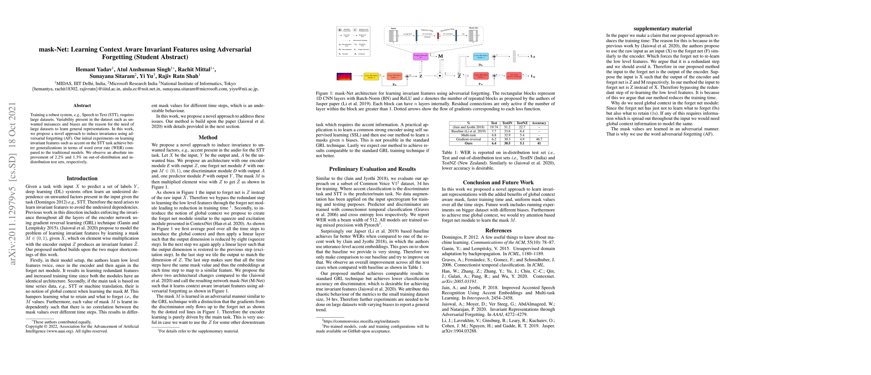 This paper proposes a novel approach called mask-Net that uses adversarial forgetting to induce invariance in machine learning models, leading to improved generalization performance with 2.2% and 1.3% gains on out-of-distribution and in-distribution test sets.