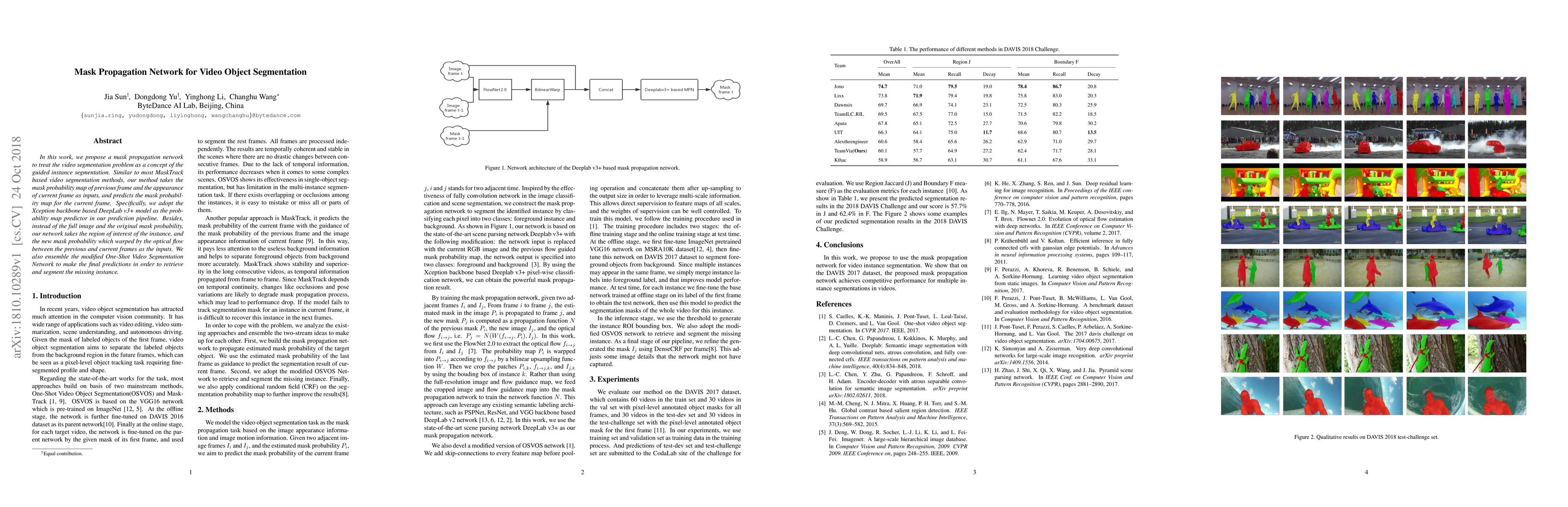 This paper introduces a mask propagation network for video object segmentation, utilizing an Xception-based DeepLab v3+ model to predict mask probability maps. It focuses on the region of interest and warps the new mask probability using optical flow, and ensembles the One-Shot Video Segmentation Network to correct and segment missing instances.