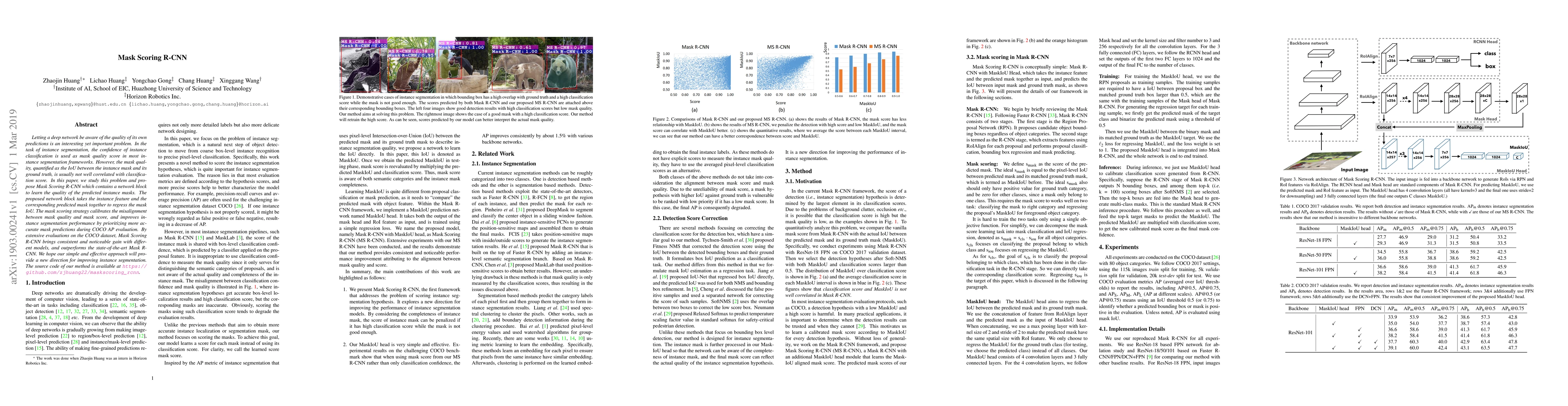 Letting a deep network be aware of the quality of its own predictions is an interesting yet important problem. In the task of instance segmentation, the confidence of instance classification is used as mask quality score in most instance segmentation frameworks. However, the mask quality, quantified as the IoU between the instance mask and its ground truth, is usually not well correlated with classification score. In this paper, we study this problem and propose Mask Scoring R-CNN which contains a network block to learn the quality of the predicted instance masks. The proposed network block takes the instance feature and the corresponding predicted mask together to regress the mask IoU. The mask scoring strategy calibrates the misalignment between mask quality and mask score, and improves instance segmentation performance by prioritizing more accurate mask predictions during COCO AP evaluation. By extensive evaluations on the COCO dataset, Mask Scoring R-CNN brings consistent and noticeable gain with different models, and outperforms the state-of-the-art Mask R-CNN. We hope our simple and effective approach will provide a new direction for improving instance segmentation. The source code of our method is available at \url{https://github.com/zjhuang22/maskscoring_rcnn}.