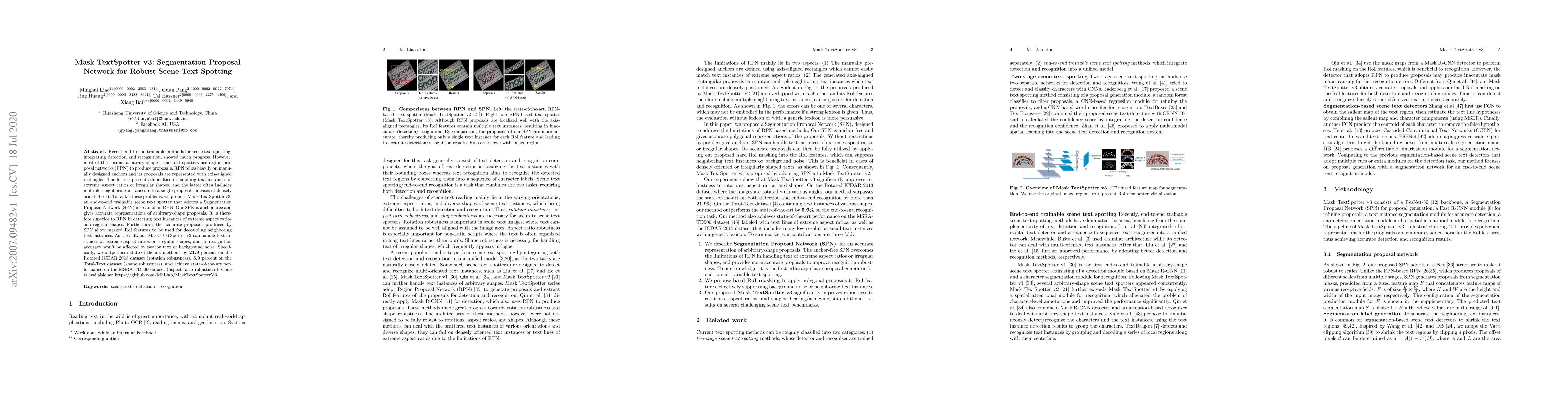 Mask TextSpotter v3 introduces a Segmentation Proposal Network (SPN) to replace traditional region proposal networks (RPN) for more accurate detection of arbitrary-shaped scene text, achieving superior performance on datasets with extreme aspect ratios and irregularly shaped text. The SPN's anchor-free approach enhances robustness and recognition accuracy.