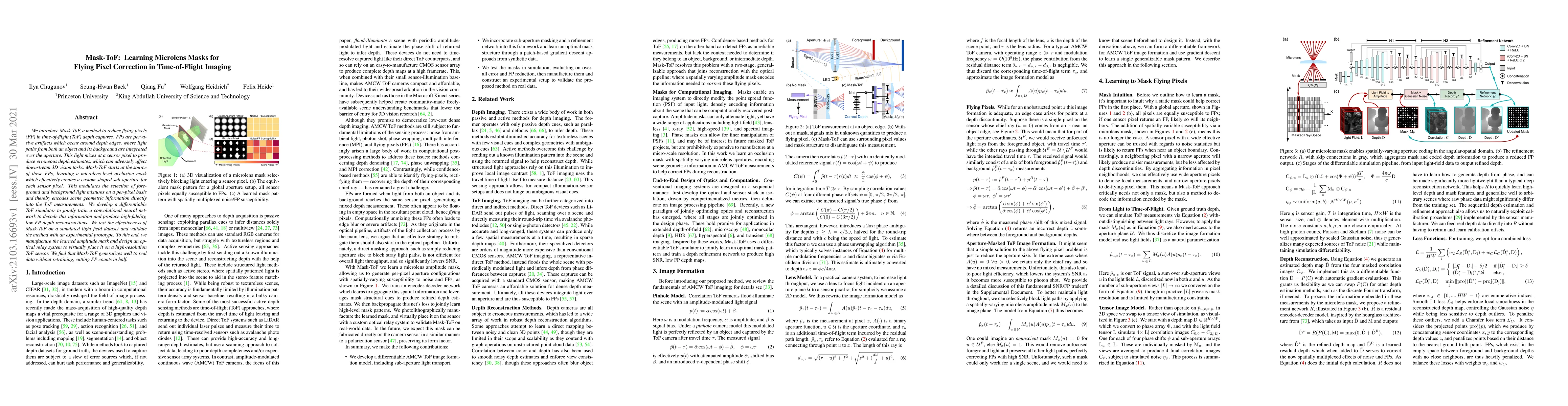 Mask-ToF is a method that reduces flying pixels (FP) in Time-of-Flight (ToF) depth images by learning microlens masks. These masks create custom sub-apertures for each sensor pixel, modulating light selection to minimize erroneous depth estimates caused by light mixing at depth edges. Trained with a differentiable ToF simulator and a convolutional neural network, Mask-ToF cuts FP counts in half on real data without retraining.