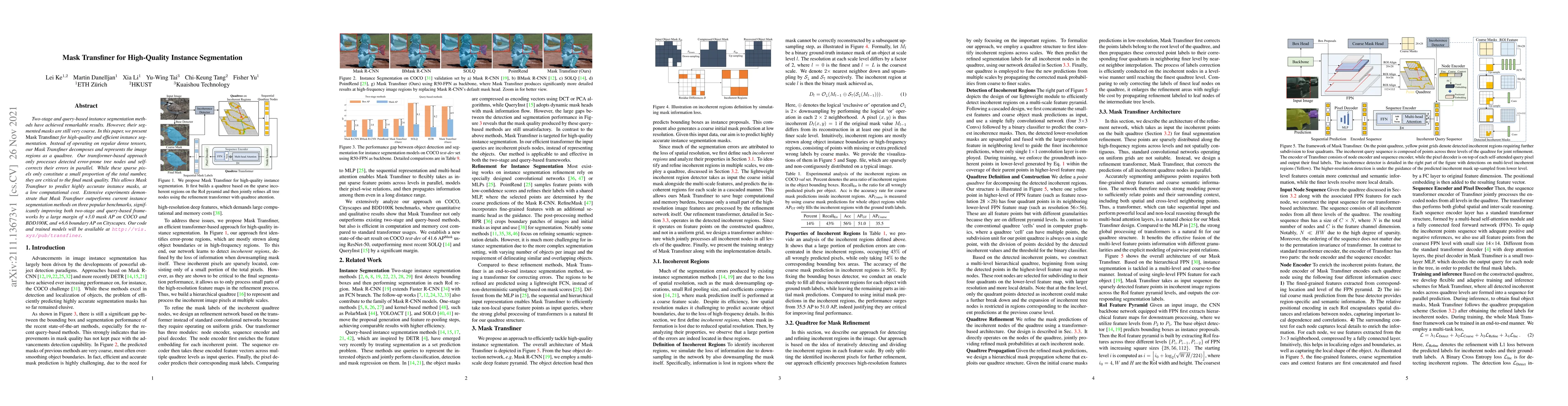 This paper introduces Mask Transfiner, a transformer-based method for high-quality instance segmentation that uses a quadtree representation to focus on error-prone regions, achieving highly accurate masks with lower computational cost. Experiments show it outperforms existing methods by a significant margin on multiple benchmarks.