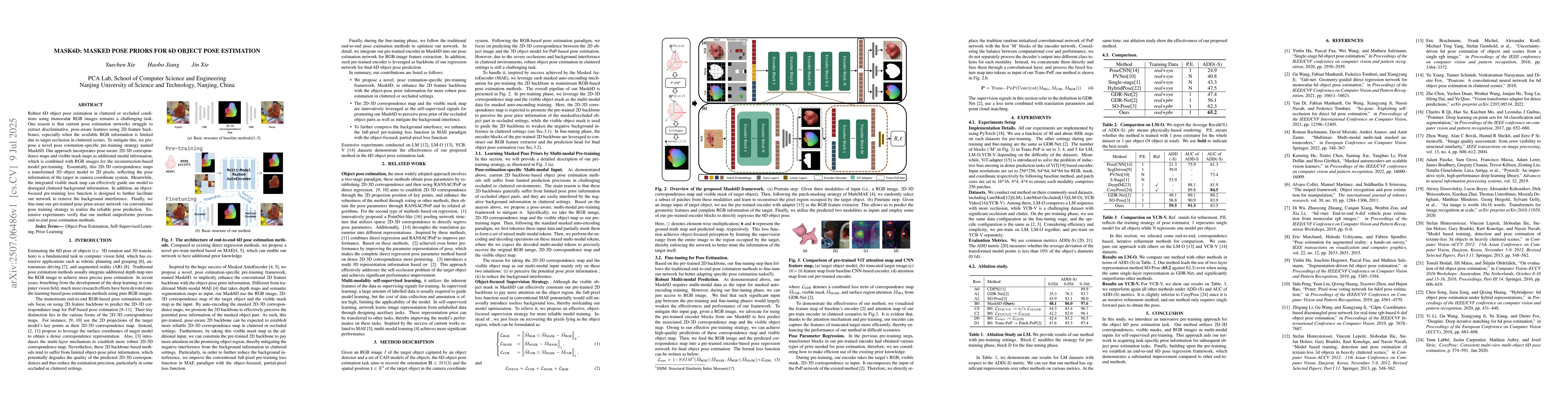 Robust 6D object pose estimation in cluttered or occluded conditions using monocular RGB images remains a challenging task. One reason is that current pose estimation networks struggle to extract discriminative, pose-aware features using 2D feature backbones, especially when the available RGB information is limited due to target occlusion in cluttered scenes. To mitigate this, we propose a novel pose estimation-specific pre-training strategy named Mask6D. Our approach incorporates pose-aware 2D-3D correspondence maps and visible mask maps as additional modal information, which is combined with RGB images for the reconstruction-based model pre-training. Essentially, this 2D-3D correspondence maps a transformed 3D object model to 2D pixels, reflecting the pose information of the target in camera coordinate system. Meanwhile, the integrated visible mask map can effectively guide our model to disregard cluttered background information. In addition, an object-focused pre-training loss function is designed to further facilitate our network to remove the background interference. Finally, we fine-tune our pre-trained pose prior-aware network via conventional pose training strategy to realize the reliable pose prediction. Extensive experiments verify that our method outperforms previous end-to-end pose estimation methods.
