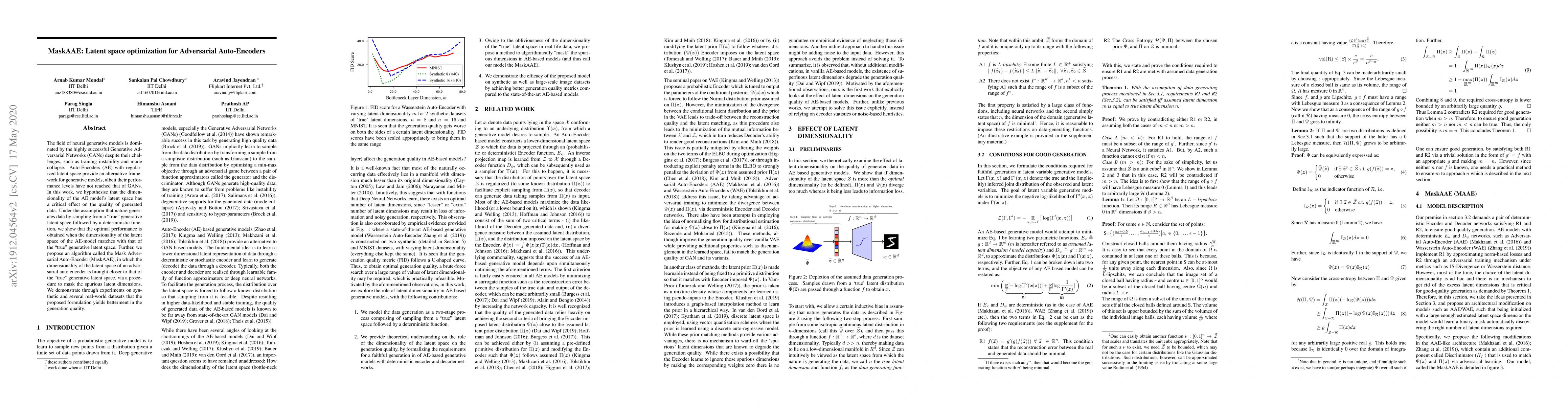 The field of neural generative models is dominated by the highly successful Generative Adversarial Networks (GANs) despite their challenges, such as training instability and mode collapse. Auto-Encoders (AE) with regularized latent space provide an alternative framework for generative models, albeit their performance levels have not reached that of GANs. In this work, we hypothesise that the dimensionality of the AE model's latent space has a critical effect on the quality of generated data. Under the assumption that nature generates data by sampling from a "true" generative latent space followed by a deterministic function, we show that the optimal performance is obtained when the dimensionality of the latent space of the AE-model matches with that of the "true" generative latent space. Further, we propose an algorithm called the Mask Adversarial Auto-Encoder (MaskAAE), in which the dimensionality of the latent space of an adversarial auto encoder is brought closer to that of the "true" generative latent space, via a procedure to mask the spurious latent dimensions. We demonstrate through experiments on synthetic and several real-world datasets that the proposed formulation yields betterment in the generation quality.