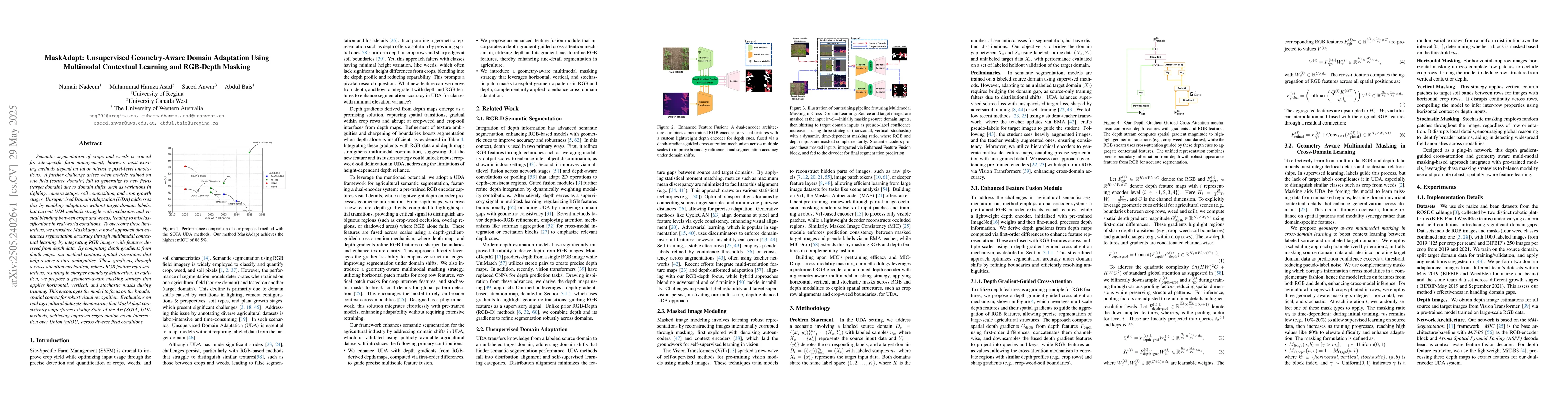This research paper introduces MaskAdapt, a novel approach to unsupervised domain adaptation for semantic segmentation in agricultural fields, achieving improved accuracy through multimodal contextual learning and geometry-aware masking strategies.
