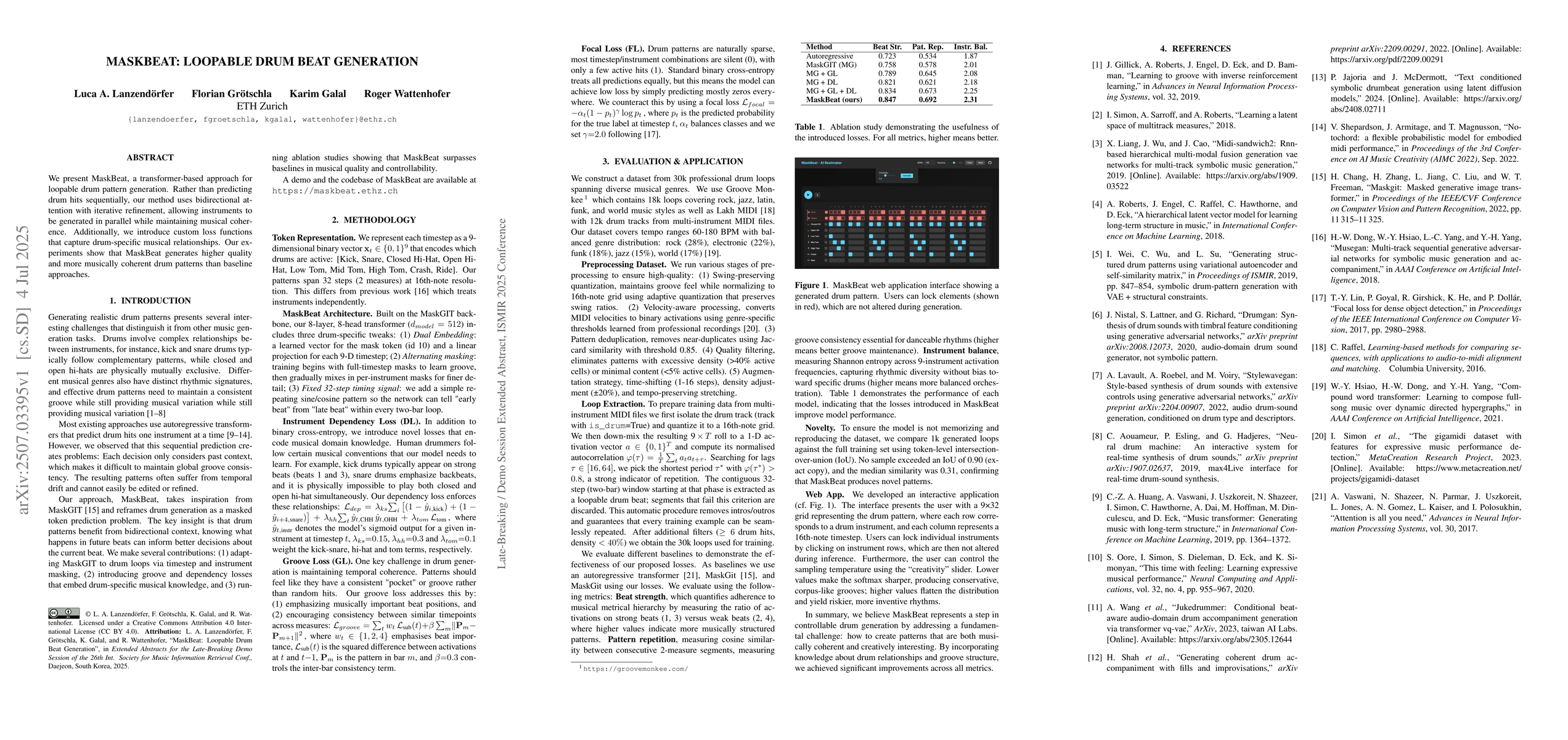 We present MaskBeat, a transformer-based approach for loopable drum pattern generation. Rather than predicting drum hits sequentially, our method uses bidirectional attention with iterative refinement, allowing instruments to be generated in parallel while maintaining musical coherence. Additionally, we introduce custom loss functions that capture drum-specific musical relationships. Our experiments show that MaskBeat generates higher quality and more musically coherent drum patterns than baseline approaches.