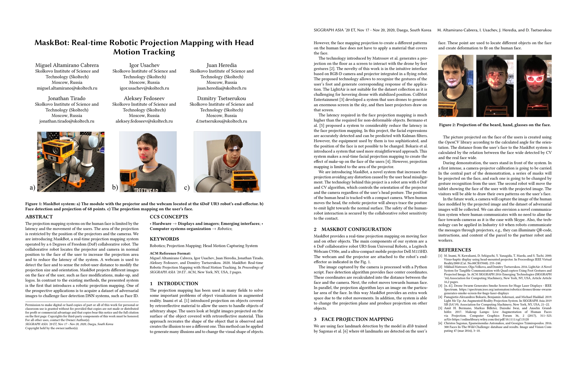 The projection mapping systems on the human face is limited by the latency and the movement of the users. The area of the projection is restricted by the position of the projectors and the cameras. We are introducing MaskBot, a real-time projection mapping system operated by a 6 Degrees of Freedom (DoF) collaborative robot. The collaborative robot locates the projector and camera in normal position to the face of the user to increase the projection area and to reduce the latency of the system. A webcam is used to detect the face and to sense the robot-user distance to modify the projection size and orientation. MaskBot projects different images on the face of the user, such as face modifications, make-up, and logos. In contrast to the existing methods, the presented system is the first that introduces a robotic projection mapping. One of the prospective applications is to acquire a dataset of adversarial images to challenge face detection DNN systems, such as Face ID.