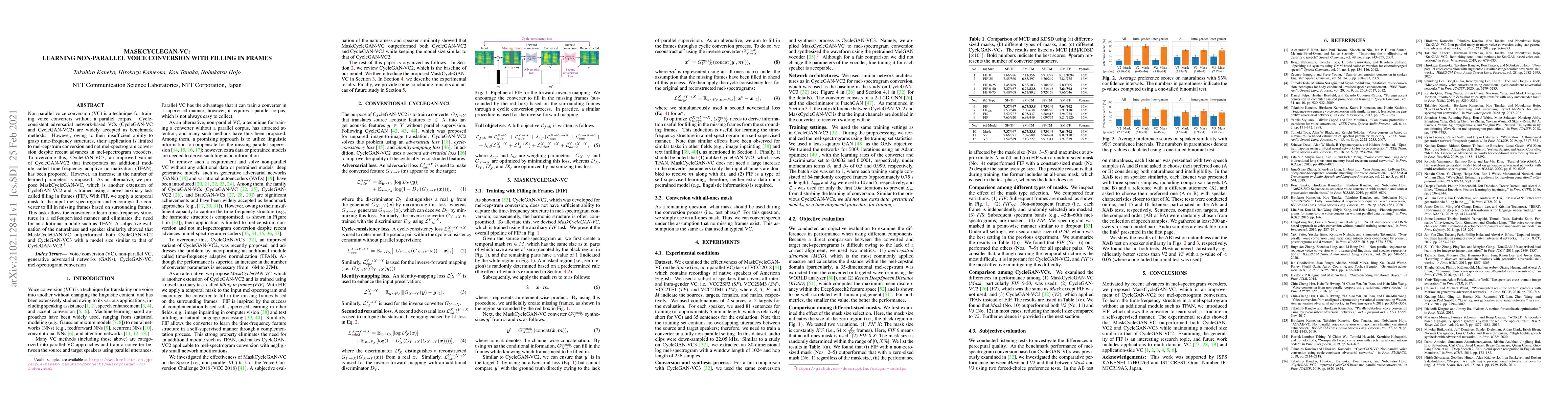 MaskCycleGAN-VC introduces a novel filling in frames (FIF) auxiliary task to enhance non-parallel voice conversion without requiring additional modules, achieving superior performance in time-frequency structure learning compared to CycleGAN-VC2 and CycleGAN-VC3. The method maintains a comparable model size while improving naturalness and speaker similarity in voice conversion.