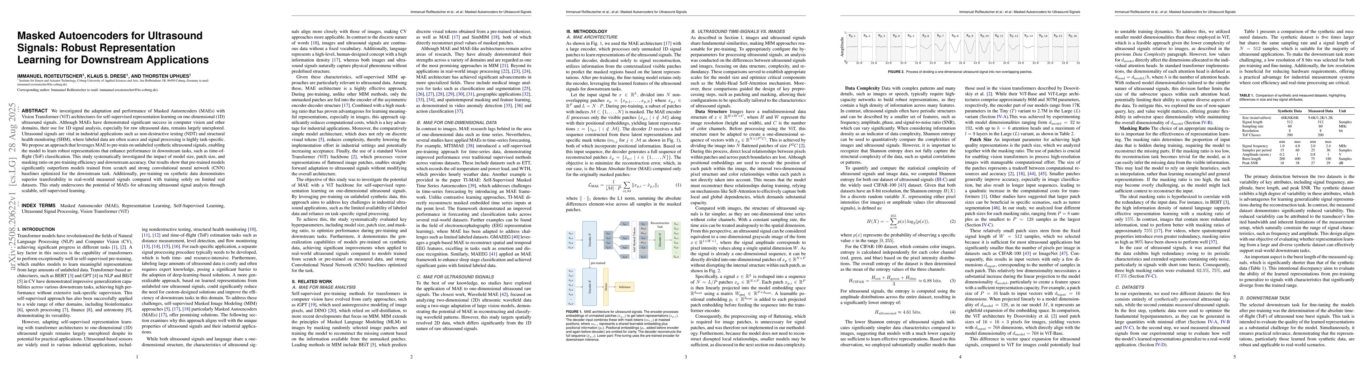 We investigated the adaptation and performance of Masked Autoencoders (MAEs) with Vision Transformer (ViT) architectures for self-supervised representation learning on one-dimensional (1D) ultrasound signals. Although MAEs have demonstrated significant success in computer vision and other domains, their use for 1D signal analysis, especially for raw ultrasound data, remains largely unexplored. Ultrasound signals are vital in industrial applications such as non-destructive testing (NDT) and structural health monitoring (SHM), where labeled data are often scarce and signal processing is highly task-specific. We propose an approach that leverages MAE to pre-train on unlabeled synthetic ultrasound signals, enabling the model to learn robust representations that enhance performance in downstream tasks, such as time-of-flight (ToF) classification. This study systematically investigated the impact of model size, patch size, and masking ratio on pre-training efficiency and downstream accuracy. Our results show that pre-trained models significantly outperform models trained from scratch and strong convolutional neural network (CNN) baselines optimized for the downstream task. Additionally, pre-training on synthetic data demonstrates superior transferability to real-world measured signals compared with training solely on limited real datasets. This study underscores the potential of MAEs for advancing ultrasound signal analysis through scalable, self-supervised learning.